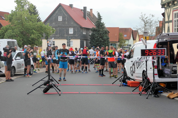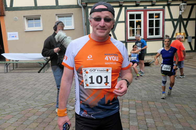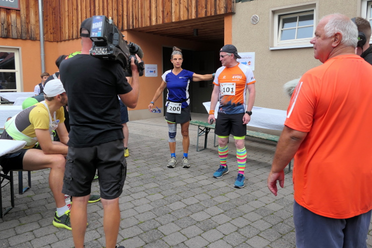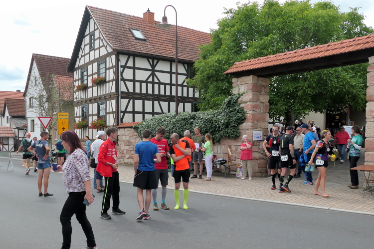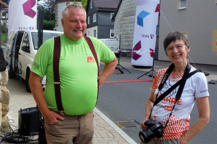 Ausreichend Parkplätze sind am Start in Gumpelstadt versprochen und werden auch gefunden. Bei etwas mehr als 60 Teilnehmern nicht ganz so schwierig. Da wir noch recht früh dran sind, finden wir direkt einen an der Kulturscheune, an der sich neben der Startausgabe auch Start und Ziel befinden. Kaum ausgestiegen, werden Silke und ich auch schon von Heike und ihrem Begleiter Dieter begrüßt. Heute wird es ihr Jubiläum mit dem 200. Marathon. Die Presse ist informiert und ein Fernsehteam wartet bereits. Damit bin ich heute Zeuge von zwei Jubiläen, denn die Veranstaltung erlebt ihre 20. Austragung.