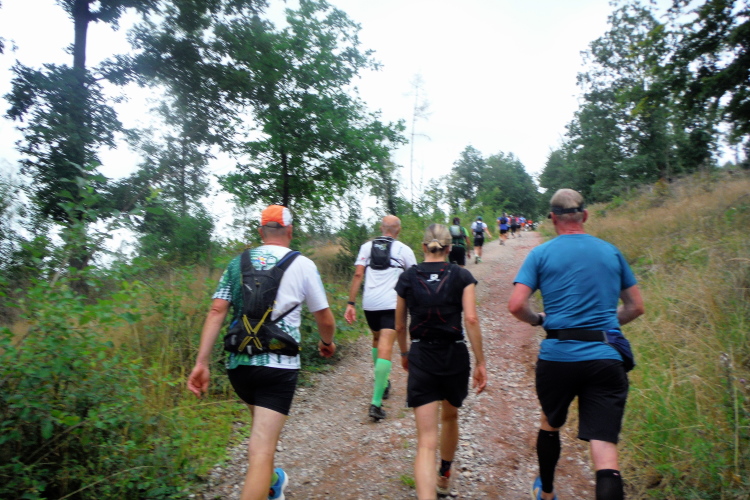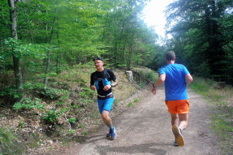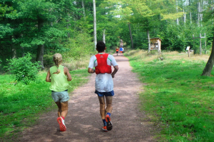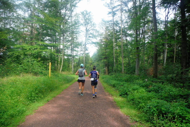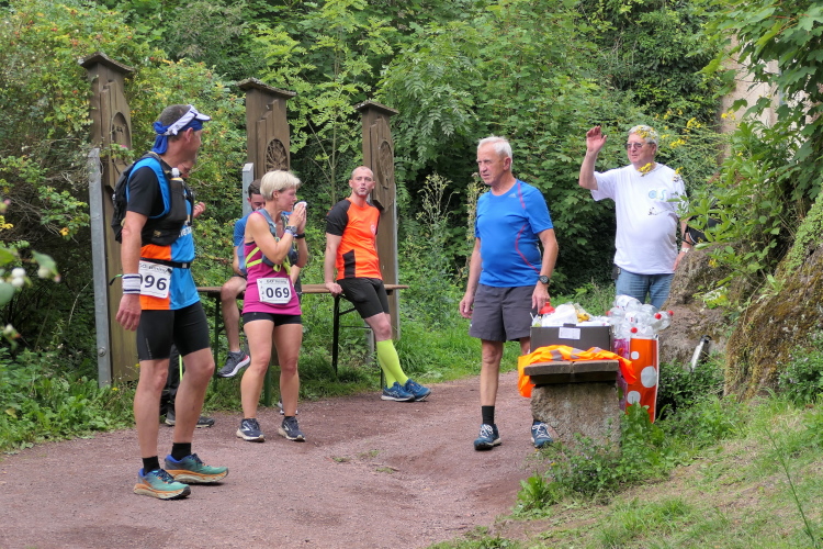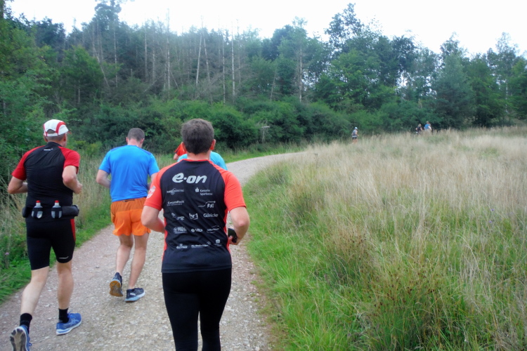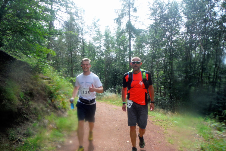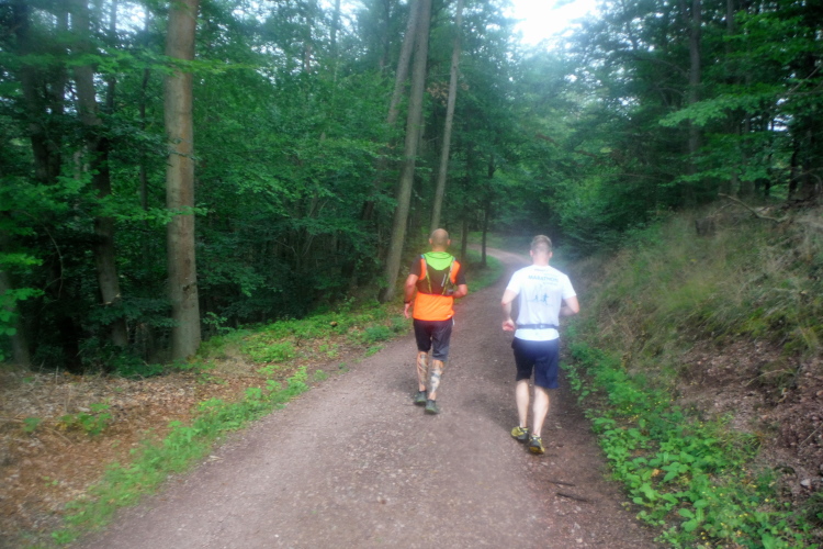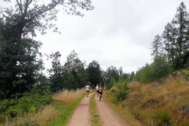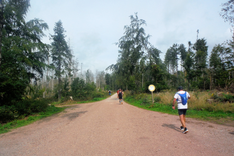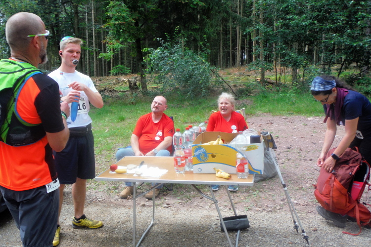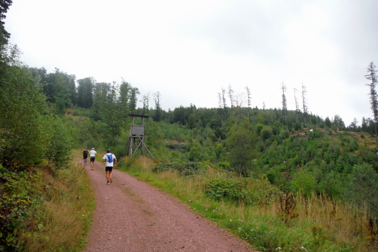Auf der nächsten Kuppe warten die ersten Zuschauer. Es werden nicht die letzten sein. Auch wenn es insgesamt natürlich nicht sehr viele sind, kommt es immer mal wieder zu Begegnungen,. Es gibt ja auch noch den Halbmarathonis und Staffelwettbewerbe. Zudem ist der Pummpälzweg in Verbindung mit dem Rennsteig ein beliebtes Wandergebiet. Die Wanderwege sind meist breit und gut ausgebaut. Arne holt mich ein, ich schließe mich ihm für die nächsten Kilometer an.