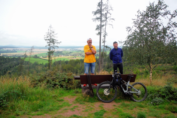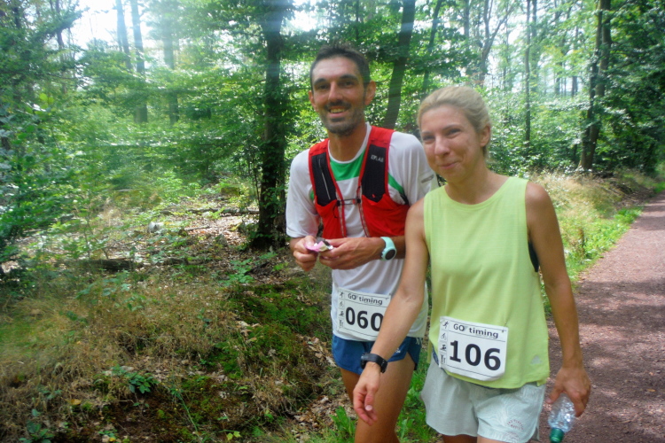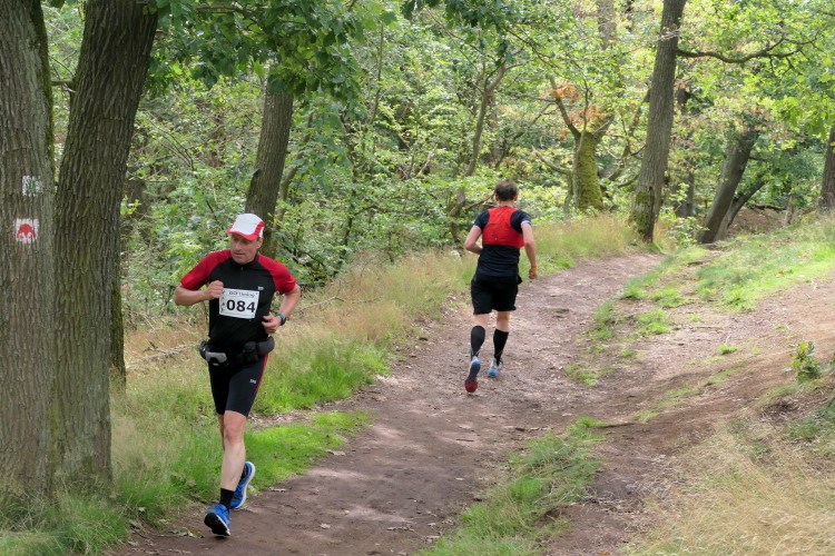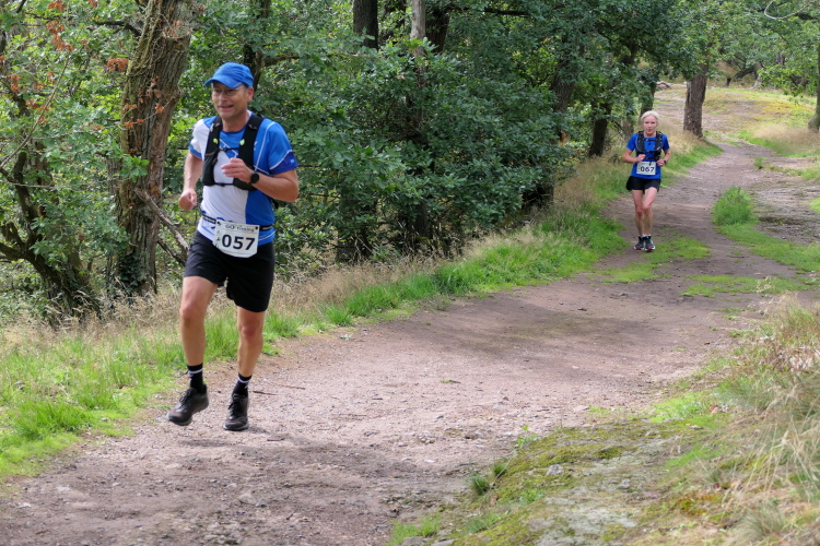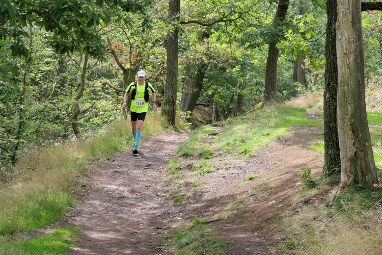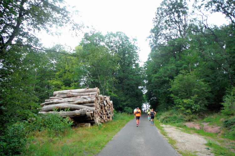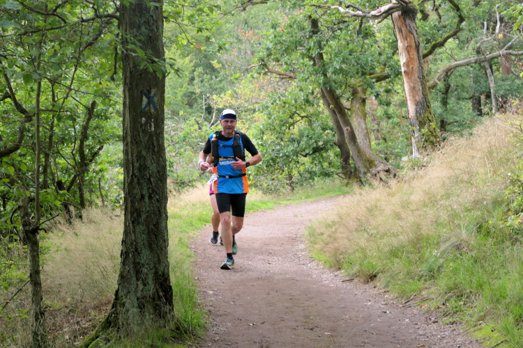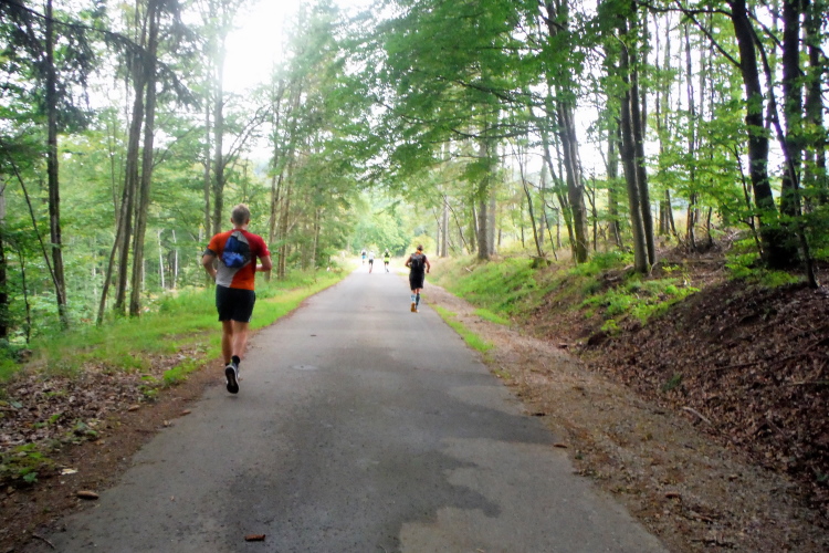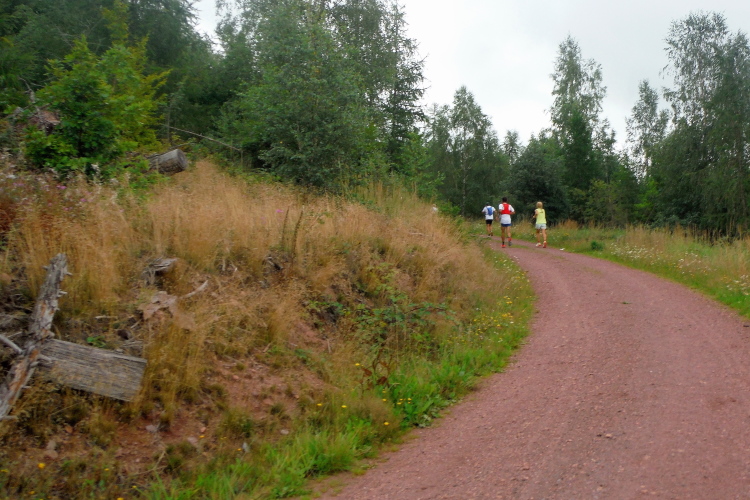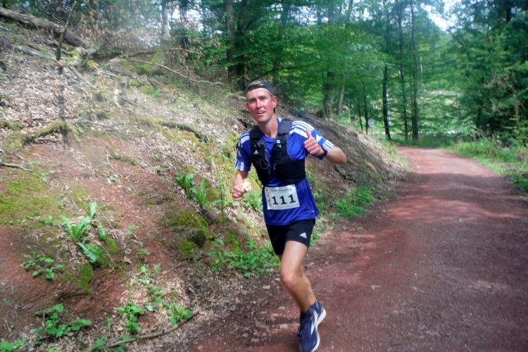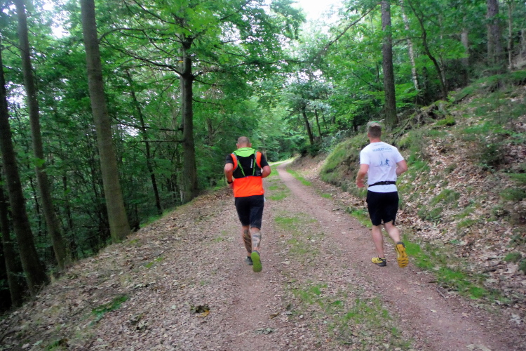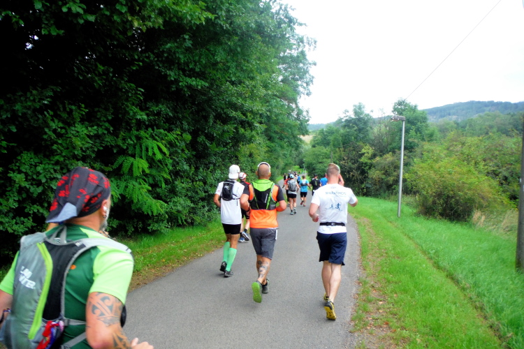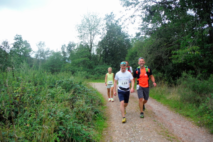 Auf der nächsten Kuppe warten die ersten Zuschauer. Es werden nicht die letzten sein. Auch wenn es insgesamt natürlich nicht sehr viele sind, kommt es immer mal wieder zu Begegnungen,. Es gibt ja auch noch den Halbmarathonis und Staffelwettbewerbe. Zudem ist der Pummpälzweg in Verbindung mit dem Rennsteig ein beliebtes Wandergebiet. Die Wanderwege sind meist breit und gut ausgebaut. Arne holt mich ein, ich schließe mich ihm für die nächsten Kilometer an.