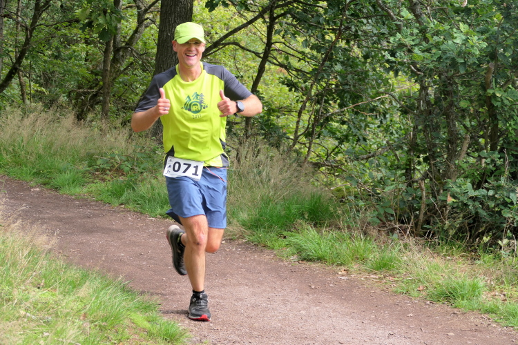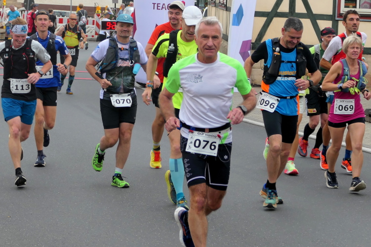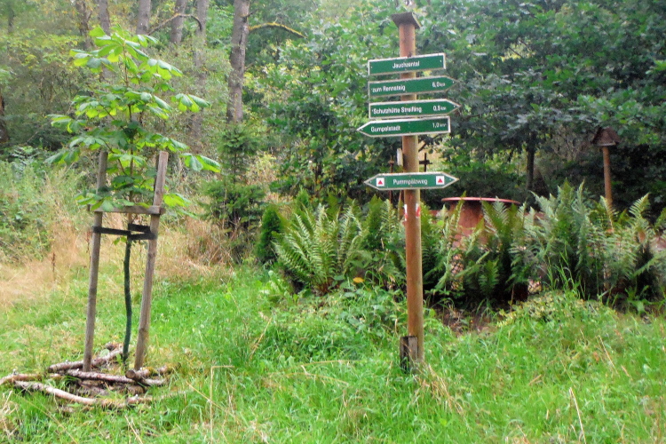 Klein aber fein ist die Ausstattung im Hof der Scheune. Die Startnummer halte ich schnell in Händen und habe noch reichlich Zeit für nette Gespräche. Nur die Zeit nicht ganz vergessen, denn pünktlich versammelt sich die kleine Läuferschar im Startbereich und wird um 9.30 Uhr mit einer Klappe auf die Strecke geschickt. Vorbei an der Georgskirche führt die Strecke noch durch den Ort, aber gleich bergan. Verwunderlich ist das nicht, denn schließlich sollen heute 1.300 Höhenmeter zu bewältigen sein. Bereits nach wenigen Metern verlassen wir den Ort auf dem Pumpälzweg, der heute meine Richtschnur sein wird. Der Pummpälz residiert in Gumpelstadt und ist der Sage nach ein kleiner Gnom, der Wanderern (und Läufern!) mit schlechten Manieren oder Gedanken und Absichten in den Nacken springt.