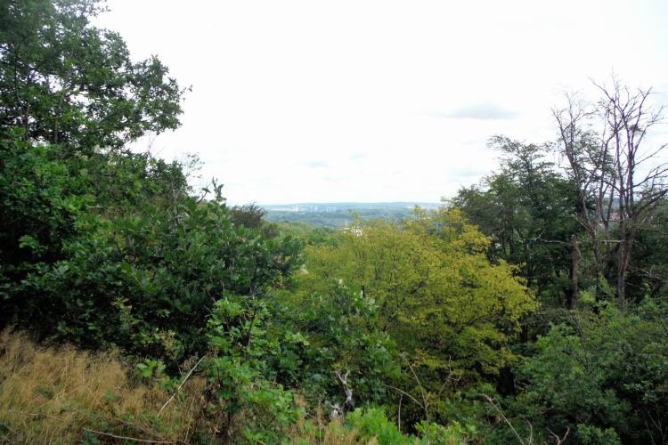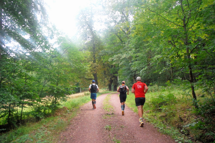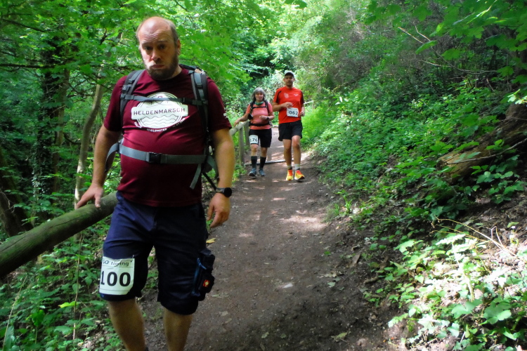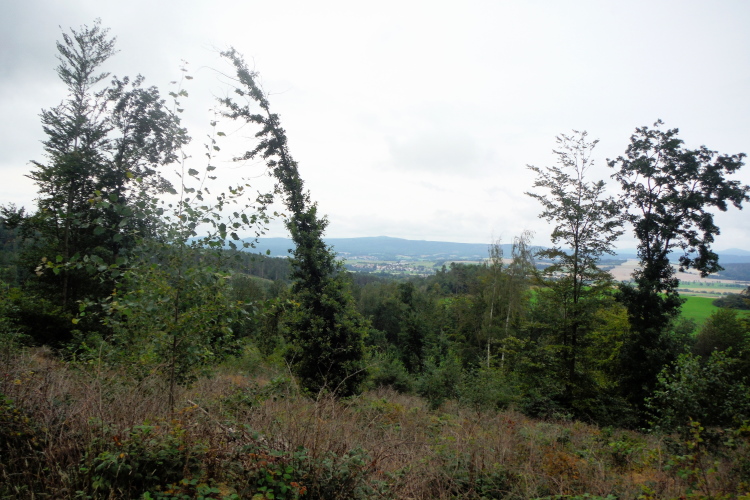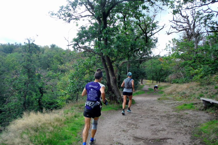 Gehpausen eingelegt. Zum Laufen wird es noch genug Passagen geben, so hoffe ich. Bereits kurz darauf ist der Weg wieder langsam zu belaufen, an Höhe habe ich bereits gewonnen und erste Blicke ins Tal sind möglich. Am Kroatengraben wurde eine Gruppe Freischärler niedergemacht, die im 30-jährigen Krieg brandschatzend durch die Gegend zogen. Alle 7 Jahre sollen sie um Mitternacht des Tages der Schlacht hier wieder erscheinen. Darauf will ich nicht warten und laufe weiter.
