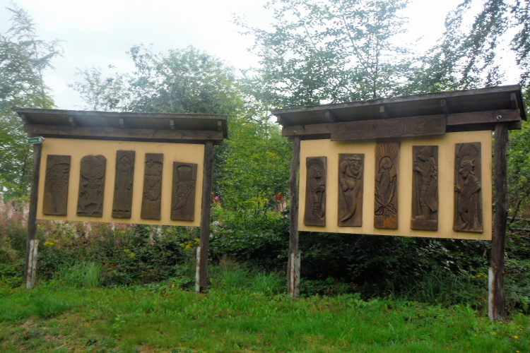Die meiste Zeit ist die Strecke ein Hin- und Rückweg. Da muss ich jetzt schon daran denken, dass ich zurück wieder hier hinauf muss. Bis dahin ist aber noch Zeit. Ich genieße den Wald, beobachte die Mitstreiter. Es ist ein munteres Überholen und überholt werden, laufen und gehen. An der nächsten Kreuzung sind rechts zahlreiche Holzschnitzereien zu bewundern.