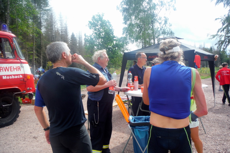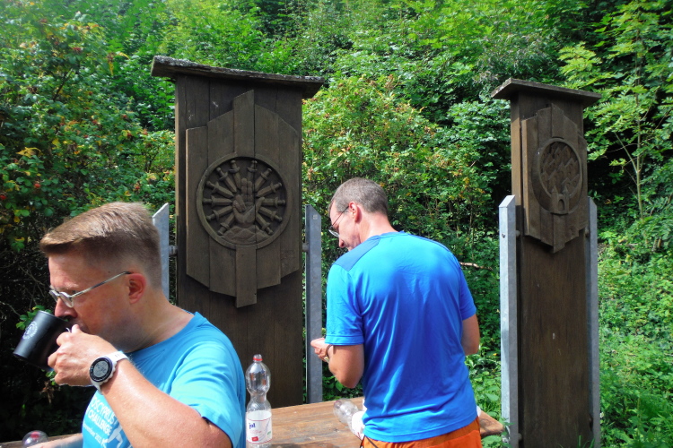 Schnell bin ich nicht mehr unbedingt, weshalb mich Maximilian und Silvio erneut überholen. Leidlich hänge ich mich an sie dran, wenn auch der Abstand allmählich größer wird. Die Verpflegungsstelle ist bereits abgebaut, Hilfe in der Not des Durstigen leistet eine Familie, die sich gerade für eine Wandertour fertig macht. Dabei fällt mir jetzt erst der Gedenkstein auf, der auf die erste Austragung des Rennsteiglaufes 1973 erinnert. An einer nahe gelegenen Quelle kann ich mich erneut erfrischen. Das haben auch Peter, Maximilian und Silvio, die ich hier einhole, nötig. Die nächste Verpflegungsstation erreichen wir bei KM 32, wo wir mit einem Bierchen entschädigt werden.