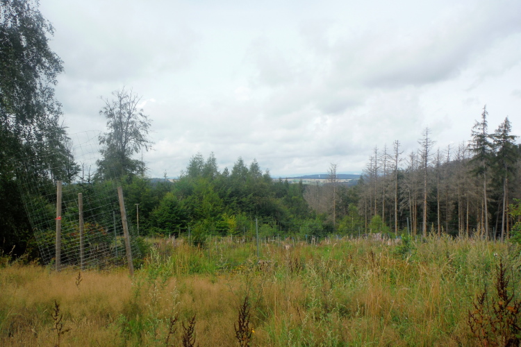 Nächster Stopp auf halbem Weg: Wanderparkplatz Hohe Sonne. Bis dahin mehren sich die Anzeichen, dass wir bereits auf dem Rennsteig unterwegs sind. Das markante R am Wegesrand ist unverkennbar. Der Wald wird durchbrochen von verschiedenen Schneisen. Kyrill hat auch hier 2007 gewütet und zahlreiche Weitblicke geschaffen. Heute mischen sich zudem des Öfteren dürre Bäume zwischen dem ansonsten noch grünen Nadelwald. Aber hier hat die Trockenheit der letzten Jahre noch keine so großen Spuren hinterlassen. Da musste ich im Harz schon anderes erleben. Liegt vielleicht aber auch am Wasserreichtum der Gegend. Am Wegesrand zähle ich schon die dritte Quelle, hier kombiniert mit einem Kneippbecken. Den nächsten Kilometer geht es leicht bergab und schon habe ich die Hohe Sonne erreicht. Fast könnte man die Stelle historisch nennen, denn am 12. Mai 1973 wurde hier der erste offizielle Rennsteiglauf (damals 100 km) gestartet.
