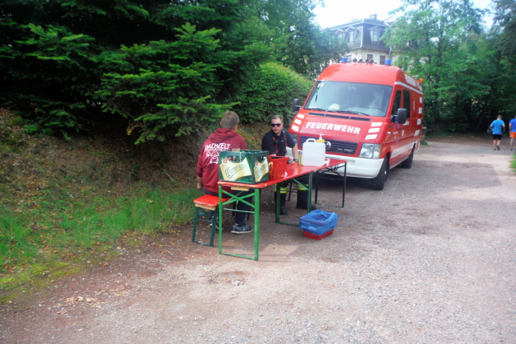 Es geht auf Kilometer 10 zu, der Wald wird lichter. Die ersten Läuferinnen und Läufer kommen mir wieder entgegen. Bin ich so langsam, dass die Spitze bereits so weit voraus ist? Nach etwas mehr als einer Stunden kann ich mir das schwer vorstellen. Es sind wohl die schnellsten Halbmarathonis, die eine Viertelstunde nach uns gestartet sind. Locker sehen sie noch aus und haben die Hälfte ihrer Strecke bereits hinter sich. Ich bin froh über die Feuerwehr mit ihrer nächsten Verpflegungsstelle, um erfrischt weiter in Richtung Wartburg zu laufen.