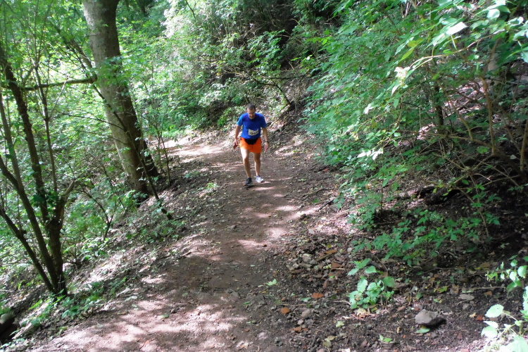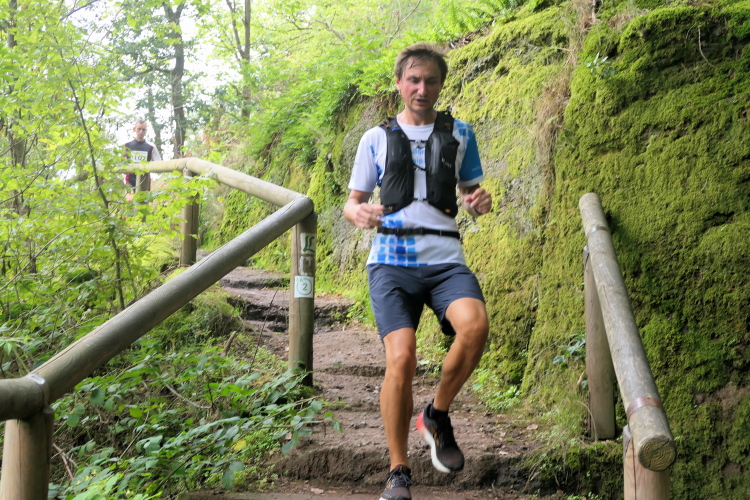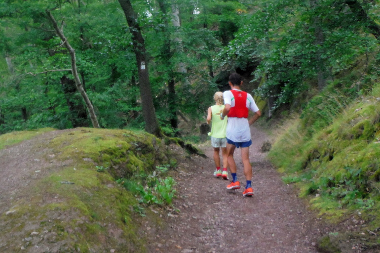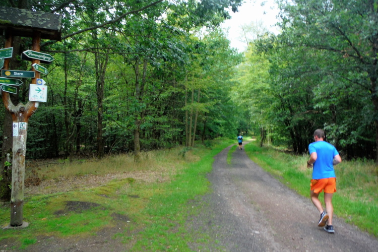 Direkt geradeaus tauche ich in den Wald hinein. Die ersten Kilometer werden trotz ordentlicher Höhenmeter noch moderat laufend bewältigt, aber es dauert nicht lange, da werden erste