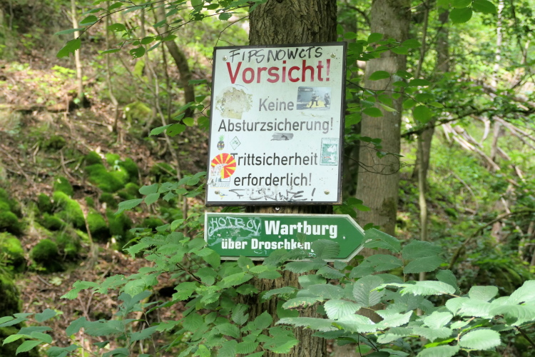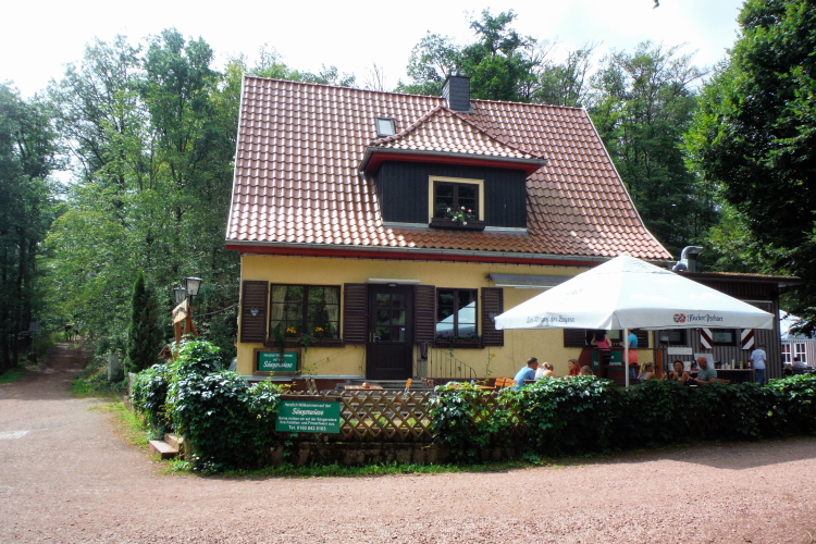 Die Serpentinen liegen gerade hinter mir, da überholt mich Heike mit Anke noch einmal, sie haben sich Zeit für eine Besichtigung genommen. Silke schickt mich derweil auf den Rückweg. Über den schmalen Pfad verlasse ich endgültig den Höhepunkt des heutigen Laufes. Schnell bin ich wieder auf den breiten Wanderpfaden des Rennsteigs. Neben den Wanderern nutzen auch zahlreiche Radfahrer das gut ausgebaute Wegenetz. Ich komme wieder an die Sängerwiese, die an den berühmten Sängerkrieg auf der Wartburg erinnert, bei dem sich sechs bekannte Dichter des Mittelalters im Wettstreit gemessen haben. Unter ihnen die auch heute noch bekannten Walther von der Vogelweide und Wolfram von Eschenbach. Ein Gasthaus lädt zum Verweilen ein, doch auf mich wartet noch eine zu lange Strecke, um dieser Einladung zu folgen. Unsere nächste Getränkestelle ist erst an der hohen Sonne.
