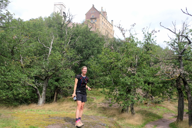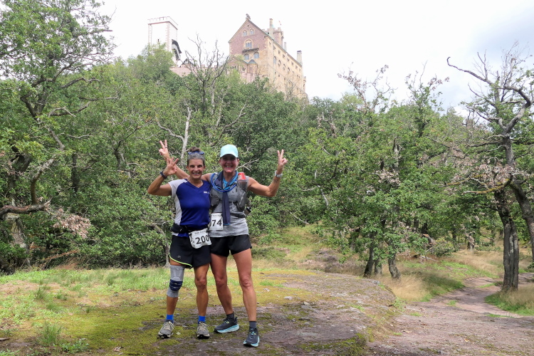Locker laufen wir weiter, bis wir Heike einholen, die gemeinsam mit Anke unterwegs ist. Hinter mir Maximilian und Silvio, die ich schnell ablichte. Frank kommt mir als erster von der Wartburg entgegen, er wird den Marathon gewinnen. Im Auf und Ab der Strecke begegnen mir immer mehr Läuferinnen und Läufer. Kann jetzt nicht mehr weit sein bis zur Halbmarathonmarke. Eine lange gerade Steigung noch, dann führt der Weg auf schmalem Pfad um Felsen herum. Ein kleiner Stau, denn links schaut man auf die Wartburg. Dieses Bild wollen sich die wenigsten entgehen lassen. Da gebe ich gerne ein paar Minuten zu, auch wenn Silke bereits auf mich wartet.