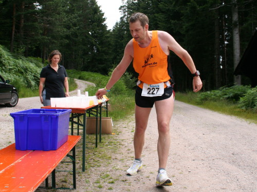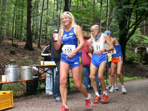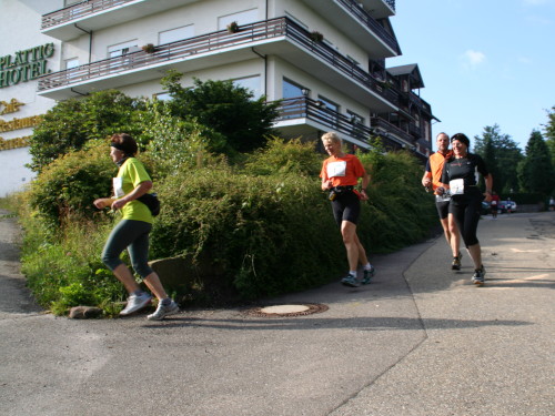 Nach einem kurzen Stück geht es rechts in den Wald bis zum Hotel Plättig. Dort läuft man rechts aufwärts Richtung Badener Höhe. Nicht weit, dann geht’s links weiter ziemlich eben auf breitem Weg Nr. 13 Richtung Scherrhof. Der Weg liegt meist noch im Schatten und es ist es sehr gut zu laufen. Nach 6 Kilometern wird die erste Verpflegungsstelle erreicht. Es gibt Tee, Iso, Wasser, Bananen und Brot. So sind auch alle anderen Verpflegungsstellen bestückt und auch für die Letzten des Feldes ist ausreichend gesorgt.