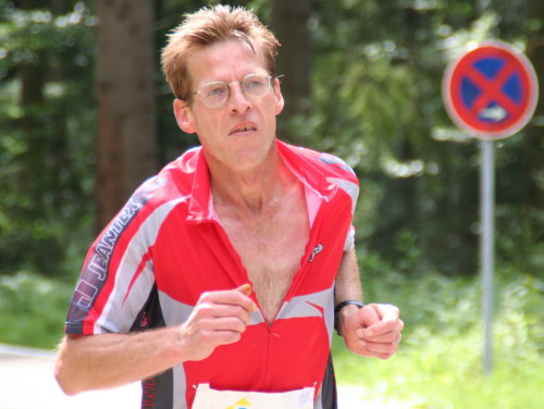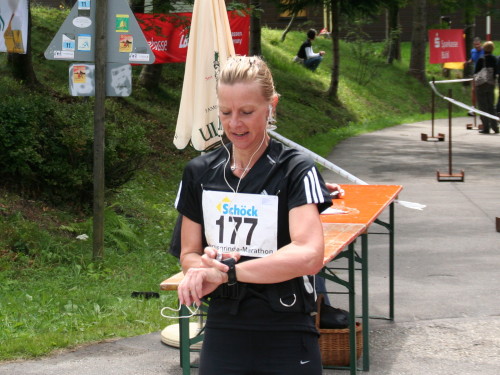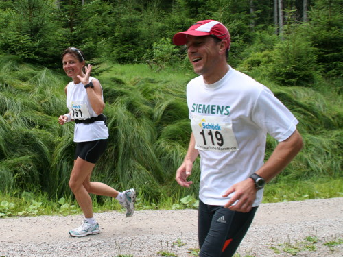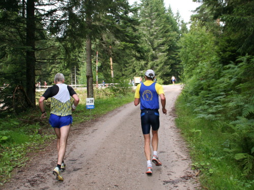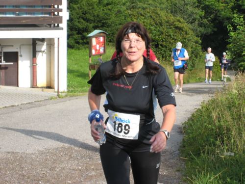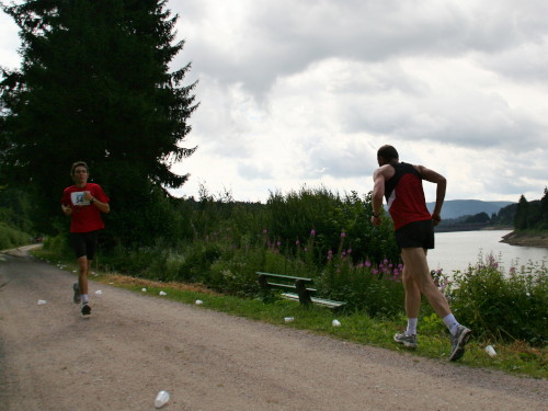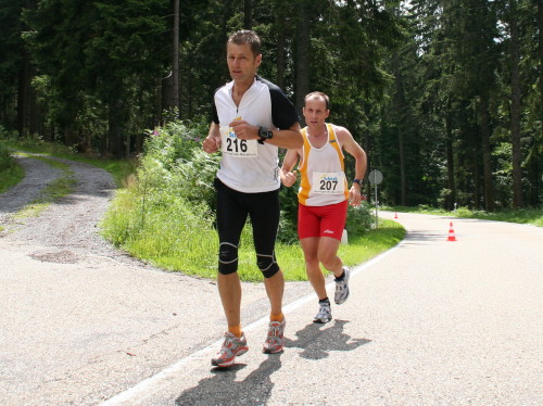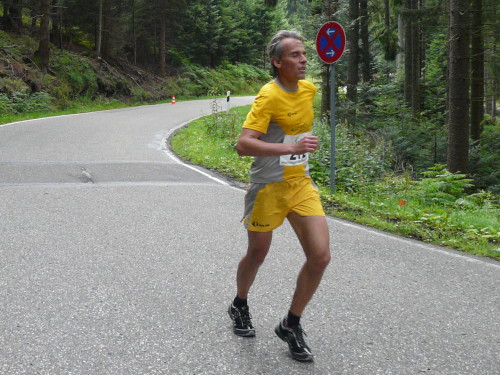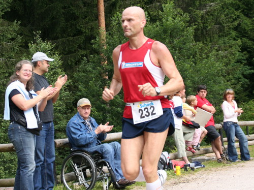 Auf einer kurzen Pendelstrecke am Seeufer entlang wird die genaue Distanz austariert. Die Wende ist ziemlich genau bei km 25. Die nächsten 2 km steigt der Weg leicht an, dann wird die Verkehrsstraße (km 28) nach Herrenwies überquert. Hier feuern etliche Zuschauer die Marathonis an.