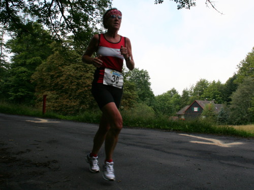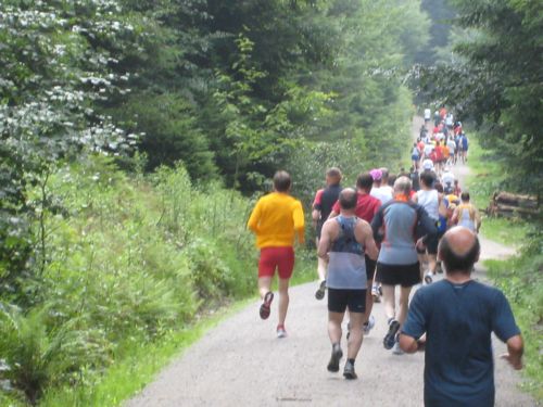 Jetzt geht es auf gutem Fahrweg (dem sogenannten Harzweg) meist flach oder in leichten, fast nicht spürbaren Wellen weiter. Die Sonne kann sich gegen die dichte Bewölkung kaum durchsetzen. Das ist auf diesem Streckenabschnitt für die Läufer ein Vorteil, denn Schatten gibt es hier, obwohl mitten im Wald, kaum. Schuld ist Orkan „Lothar“, der hier am 2. Weihnachtstag 1999 binnen weniger Stunden ganze Berghänge kahl geschlagen hat.