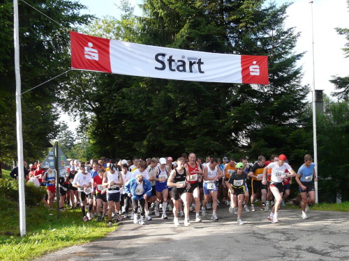 Das Wetter ist ideal an diesem Sonntagmorgen, es ist zwar ziemlich bedeckt, aber die Sonne wird sich im Laufe des Tages schon noch blicken lassen. 13 Grad zeigt das Thermometer. Das hatten wir hier schon anders. Um 8.15 Uhr wird gestartet. Es geht zunächst parallel zur Schwarzwaldhochstraße abwärts zum Kurhaus Sand. Zuerst ist es etwas eng auf dem Waldweg, aber als es kurz vor Sand auf die hier gesperrte Schwarzwaldhochstraße geht, hat sich das Läuferfeld deutlich in die Länge gezogen.
