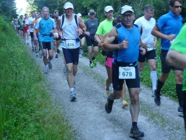 Zur Belohnung dürfen wir jetzt doch noch bergab laufen. Es folgt ein weicher mit Nadeln und Tannenzapfen übersäter Waldweg. Der dunkle Nadelwald spendet willkommenen Schatten. Die Freude endet auf einem größeren Waldparkplatz, wo eine Helferin allein in der prallen Sonne steht und uns den Weg weißt: Wir müssen scharf rechts. Mit diesem Service hat sie sicher vielen Läufern einen ärgerlichen Umweg erspart. Man hätte diese Stelle auch absperren können, aber wenn ein Scherzbold die Markierung entfernt, ist das Problem vorprogrammiert. Und menschliche Ansprache tut hin und wieder auch ganz gut. Vielen Dank!