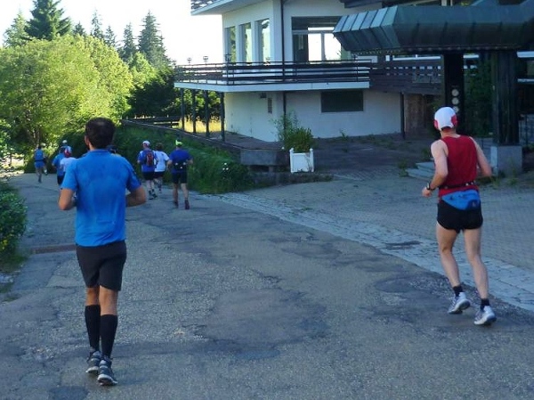 Oben halten wir uns links und erreichen einen Weg aus Betonplatten, dem wir erst mal folgen. Nach km 6 steht die erste Erfrischungsstation mit Tee, Iso und Wasser. Wir verlassen die Betonpiste um auf einem hellen Schotterweg den jetzt lichten Wald und die Schwarzwaldaussicht zu genießen. Es geht wieder leicht bergab. Bei km 12 wartet dann die nächste Erfrischung. Diesmal stehen hier auch die für den Hornisgrinde-Marathon typischen, mit Wasser gefüllten Wannen. Mütze rein und auf den Kopf gezogen - eine Wohltat. Noch ist die Temperatur angenehm, aber was ich kühlen kann, muss ich schon nicht trinken. Das wissen auch noch andere und so mache nicht nur ich Gebrauch von diesem Service.