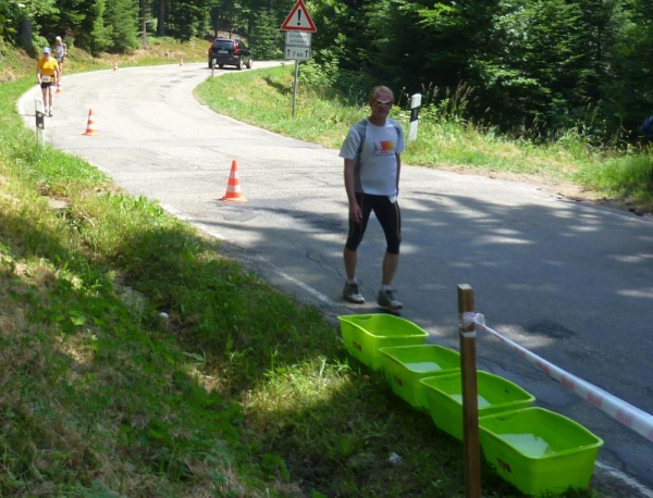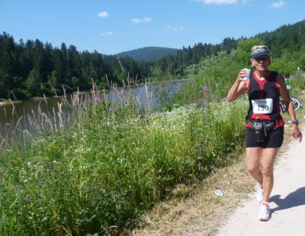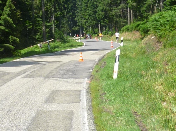 Jede Steigung hat mal ein Ende, auch diese, km 27. Es geht links auf die Brücke über den Schwarzenbach und dahinter gleich wieder links. An der Erfrischungsstation ordere ich erst mal Iso und Wasser. Danach geht es gleich besser.
