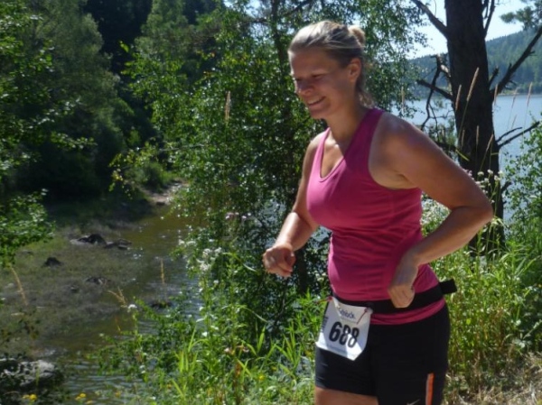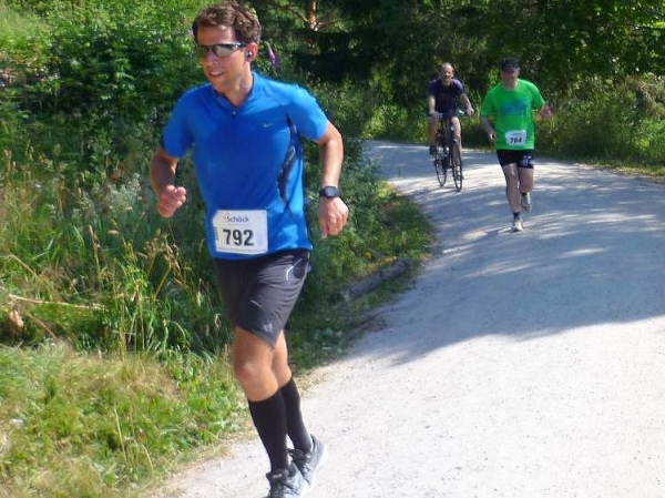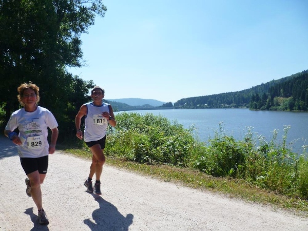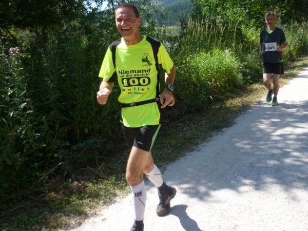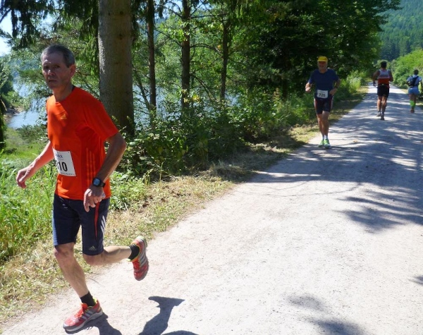 Am Anfang des Begegnungsstücks steht die Verpflegungsstelle. Ich muss erst mal was essen und trinken. Nun folgt das Highlight des Laufs: der Weg führt oberhalb des Sees entlang, der hier eine Einbuchtung hat und so, wegen der Kurven, ständig ein neues Gesicht zeigt. Dann kommt der Wendepunkt und es geht zurück. Völlig neue Ausblicke eröffnen sich. Außerdem kann man einen Blick auf die Mitstreiter werfen. Sich dieses Stück zu sparen, ist nicht ratsam. Am Wendepunkt werden nämlich die Startnummern notiert.