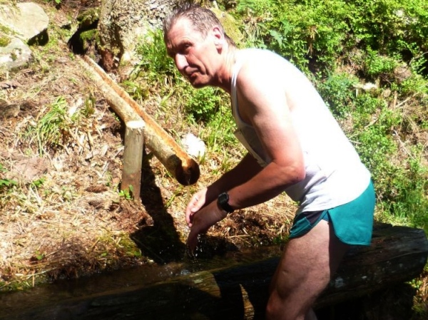 Hinter km 34 kommt die nächste VP. Es gibt noch das komplette Angebot. Ich glaub, ich bin im Paradies. Die Helferin versichert glaubhaft, dass es den Hornisgrinde-Marathon auch schon im Regen gegeben hätte. Was war nochmal "Regen"? Nur schemenhaft ist mir kühles Nass vom Himmel in Erinnerung. Irgendwann muss ich weiter. Aufgeben ist keine Option. Hier liegt schon ein bedauernswertes Hitzeopfer auf der Trage, vom Sani bestens betreut. Nein, soweit bin ich noch nicht!