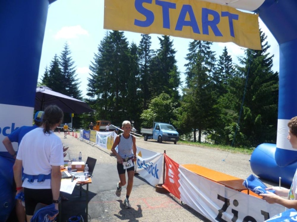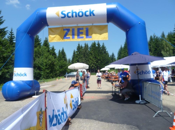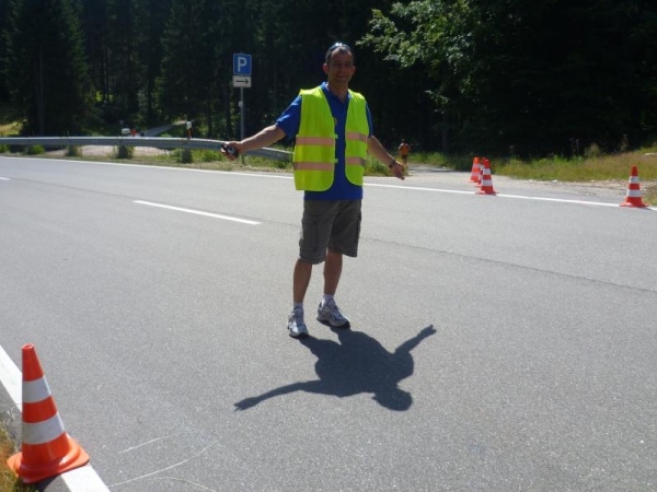 Erstaunlich schnell erreiche ich die B 500. Hier beginnt der letzte Anstieg an der Straße entlang. Mit Pylonen ist ein kleiner Weg für die Läufer abgetrennt. Beim Gehen merke ich, dass wieder Kraft in den Beinen ist. Ich versuche es und es geht tatsächlich - ich kann laufen! Um nicht übermütig zu werden, laufe ich immer bis zum 2. Pylon, dann gehe ich dieselbe Strecke. Das funktioniert prima. Gleich bin ich oben. Ein Helfer ruft: "Das Ziel ist nah!". Nochmal scharf rechts, eine Böschung hinauf, ein Stückchen über die Wiese, der Parkplatz ist schon da. Ein paar Zuschauer feuern mich an. Das Ziel kommt in Riesenschritten näher. Noch ein Foto. Geschafft! Zwei Helfer präsentieren die Finishergeschenke zur Auswahl: Entweder ein T-Shirt oder ein Handtuch, dieses Jahr in blau mit Hornisgrinde-Marathon-Aufdruck.
