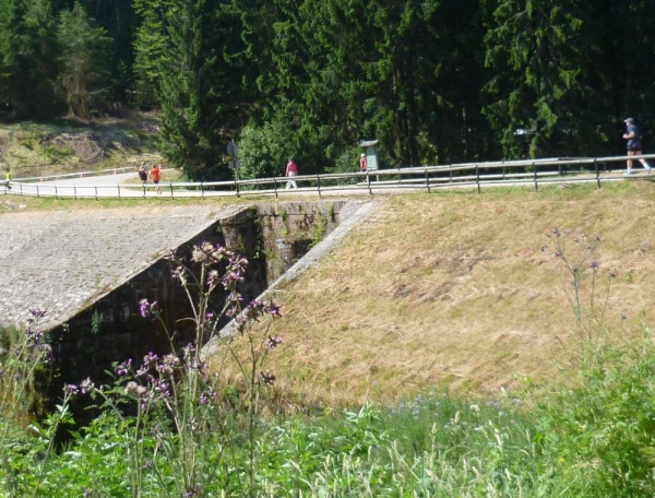 In meiner kurzen Pause sind jetzt auch drei weitere Läufer eingetroffen und gleich wieder weg. Mir ist das zu schnell und so bleibe ich allein, allerdings in Sichtweite zu den Anderen. Eine schattenlose Passage folgt, und ich merke, dass mir die Hitze zu schaffen macht. Sobald die Bäume wieder dichter stehen, geht es besser. Außerdem dürfen wir nun bergab laufen. Rechts kann ich durch die Bäume schon einen Ausläufer des Stausees der Schwarzenbachtalsperre erkennen. Dann liegt der See in seiner ganzen Länge vor mir. Das frische Blau mit dem der See in der Sonne strahlt, ist eine angenehme Abwechslung zu dem vielen Grün der letzten Stunden. Ich kann mich gar nicht satt sehen.