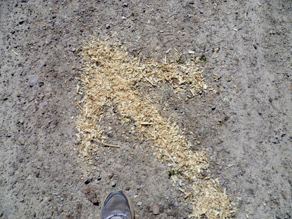 Durch Helfer gesichert überqueren wir die L 83. Der jetzt folgende Weg beginnt am Parkplatz und führt in einer großen Schleife bergauf. Ich bin wieder ganz allein. Gut, dass die Beschilderung hier vorbildlich ist: Abzweigungen sind mit großen Pfeilen aus Sägespänen auf dem Weg markiert. Außerdem steht hinter dem Abzweig noch ein blaues Schild mit Pfeil. Ich bin also auf jeden Fall richtig.