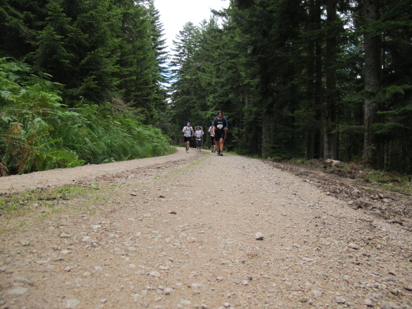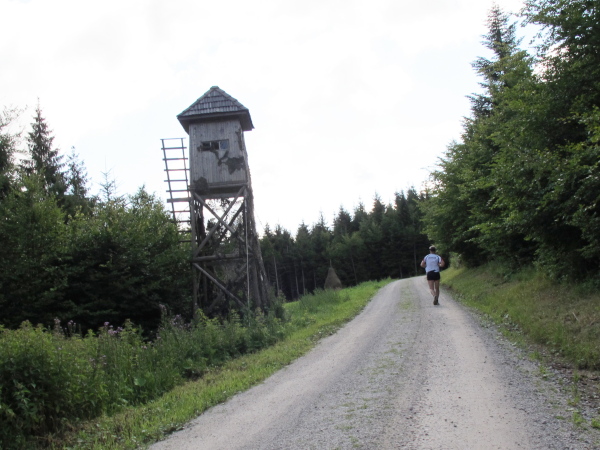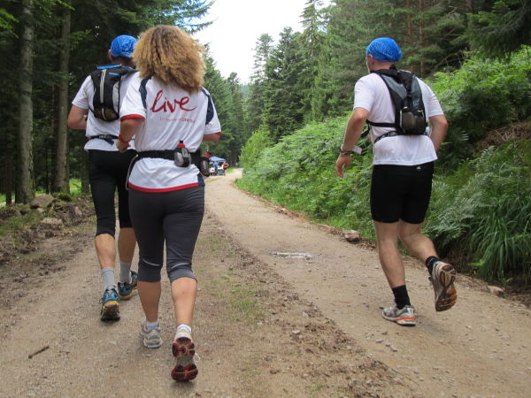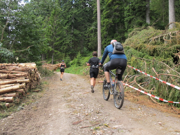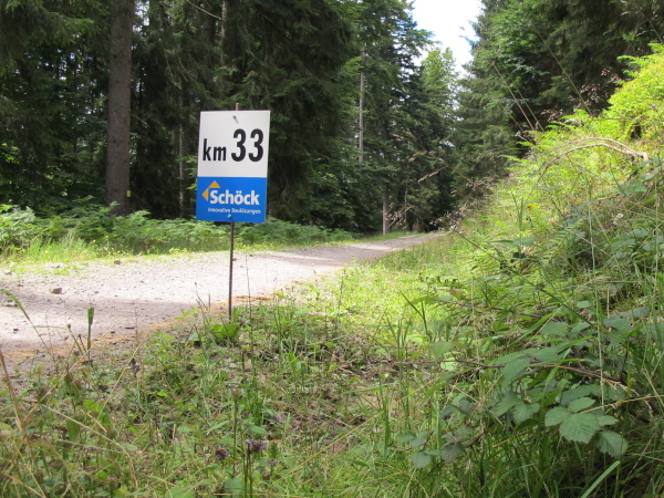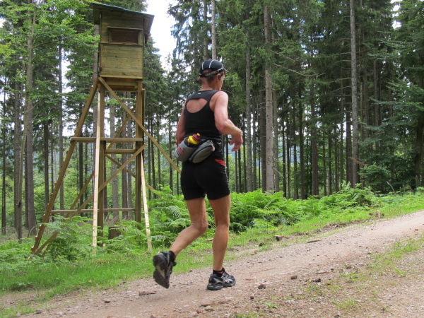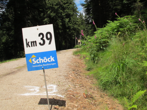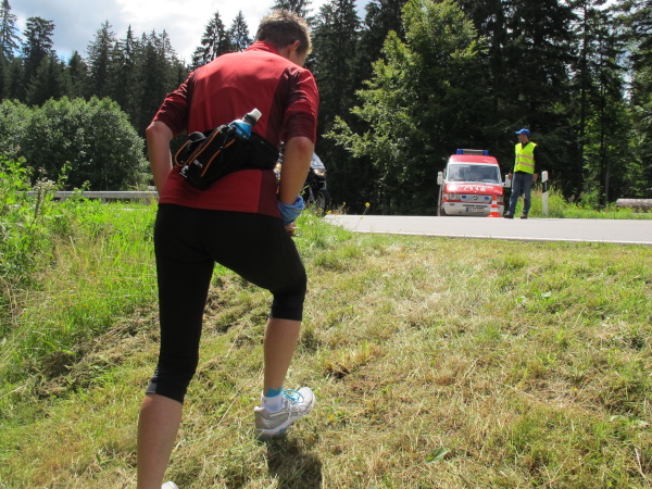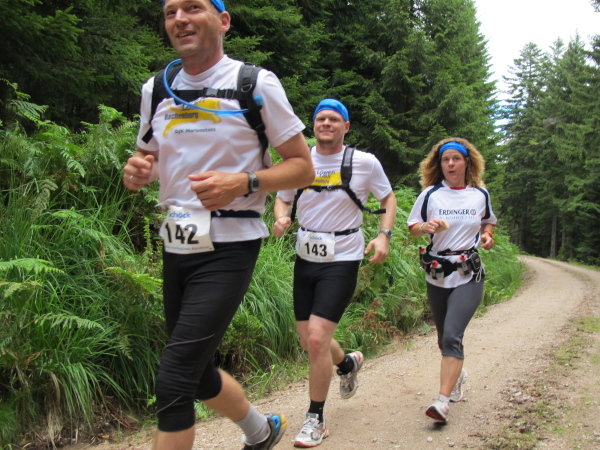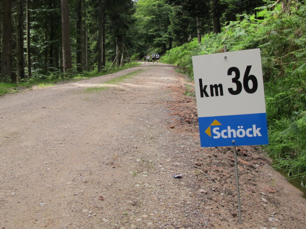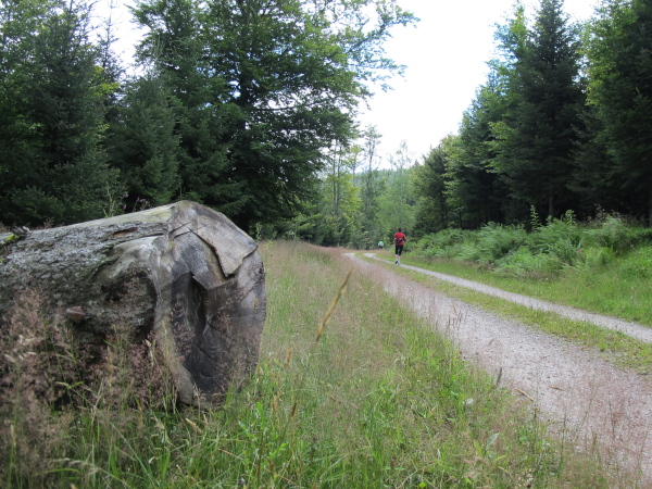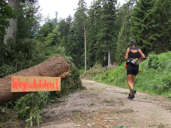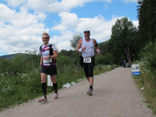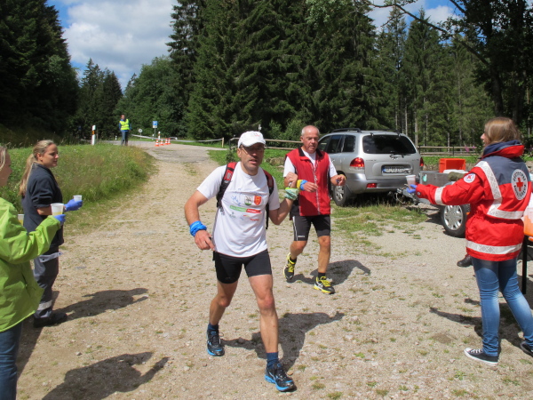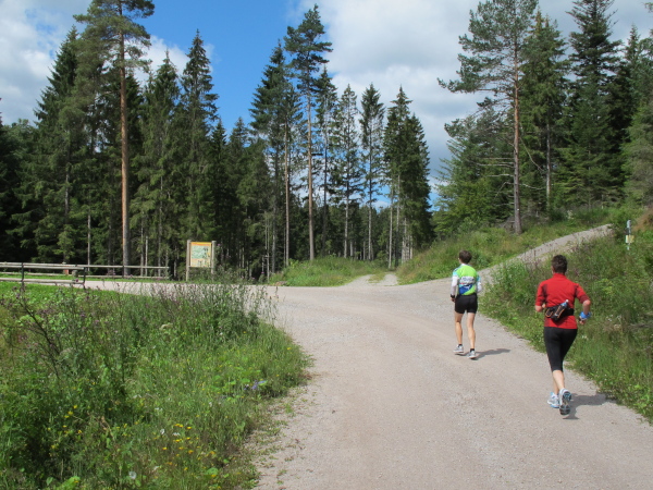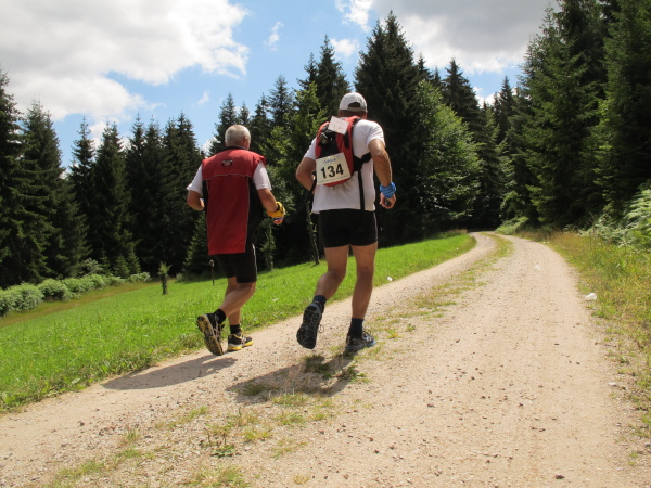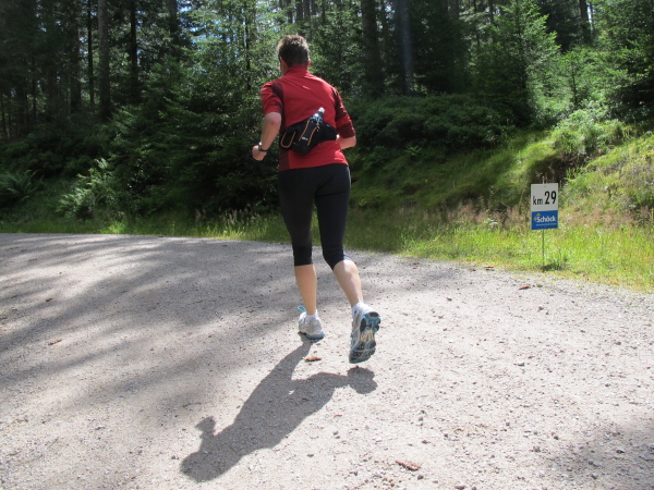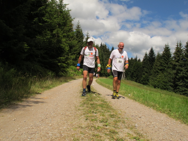 Bei km 28 erreichen wir die Verbindungsstraße zwischen der Schwarzwald-Tälerstraße und der Schwarzwaldhochstraße, die wir unter Polizeischutz überqueren. An der Getränkestelle danach holt mich nach einer etwas heftigeren, aber nur ganz kurzen Steigung ein weiteres bemerkenswertes Duo ein, Horst und Eddi. Horst ist blind. Ohne „Leine“ geleitet ihn Eddi auf der Strecke und dirigiert ihn so sicher, dass keiner der entgegenkommenden Wanderer ahnt, dass der 57jährige Läufer überhaupt nichts sieht. Dazu macht er ganz offensichtlich auch noch die Pace. Denn Eddi muss ganz schön aufpassen, dass ihm Horst nicht entwischt und doch noch gegen einen Baum läuft.