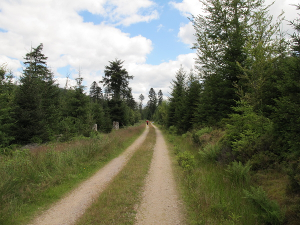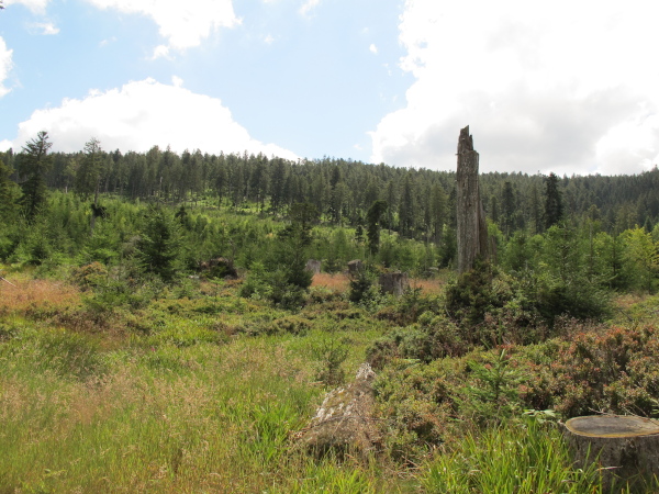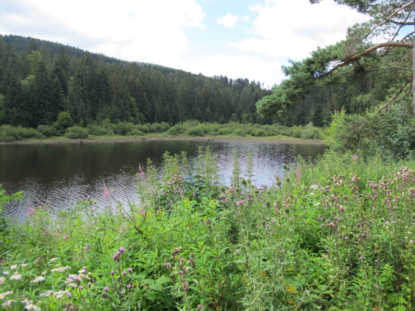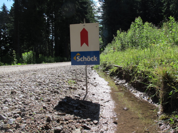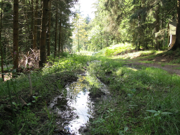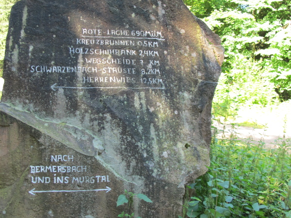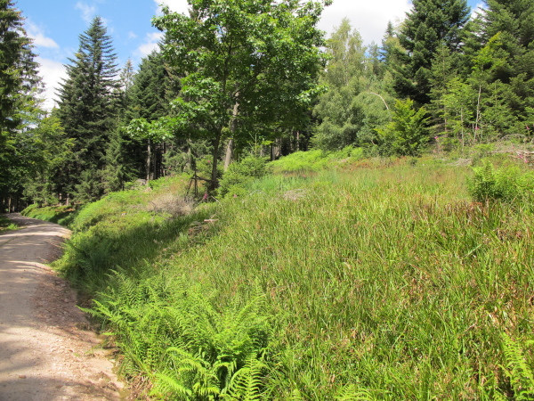 Fast drei Kilometer folgt jetzt eine herrliche Traileinlage auf einem mit Gräsern, Farn und Sträuchern teilweise fast zugewachsenem Pfad. Urwald? Grüne Hölle? Herrlich! Zecken gibt es hier keine. Hoffe ich. Bei km 15 sind wir bei der Roten Lache (690 m). Ich erkläre Euch den Namen: Pfützen kennt man im Badischen nicht. Dazu sagt man Lache. Und wegen des Buntsandsteines ist das Wasser in den Pfützen hier auf der Passhöhe zwischen Baden-Baden und dem Murgtal rot.