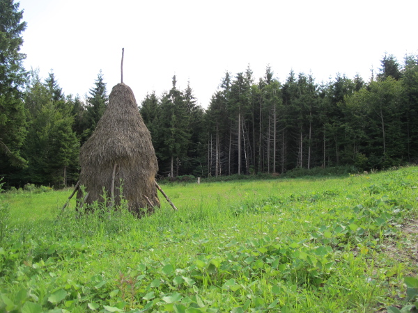 Die steilen Wiesen des oberen Murgtales reichen jetzt fast bis an die Laufstrecke heran. Wer darauf achtet, entdeckt vielleicht „ä Heihitt“, eine auf Steinsockeln errichtet Holzhütte, in der man früher Heu lagerte, um es im Winter bei Bedarf hinunter in die Ställe zu bringen. Sie sind typisch für diese Gegend.