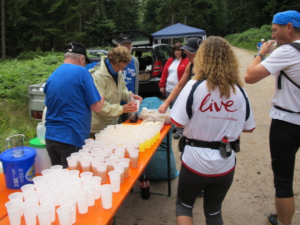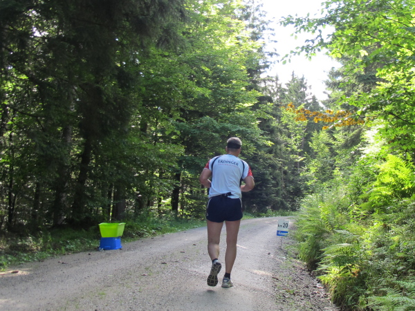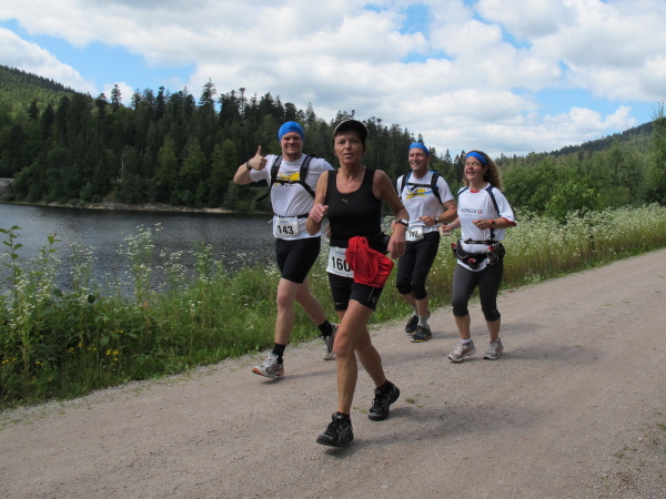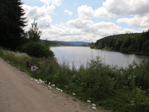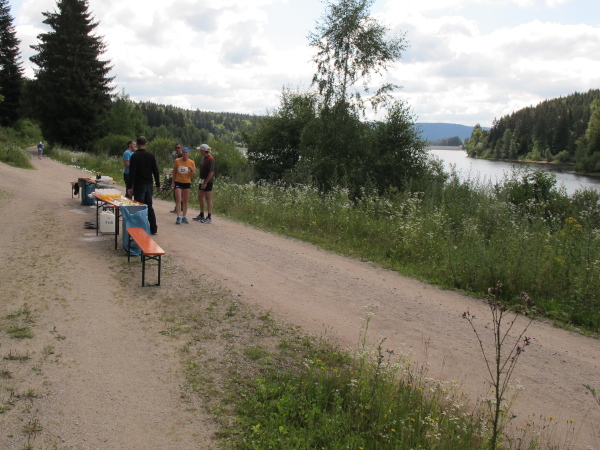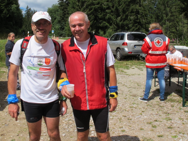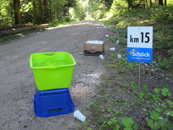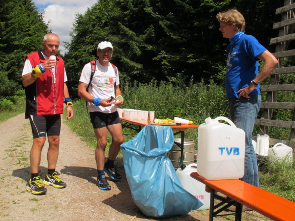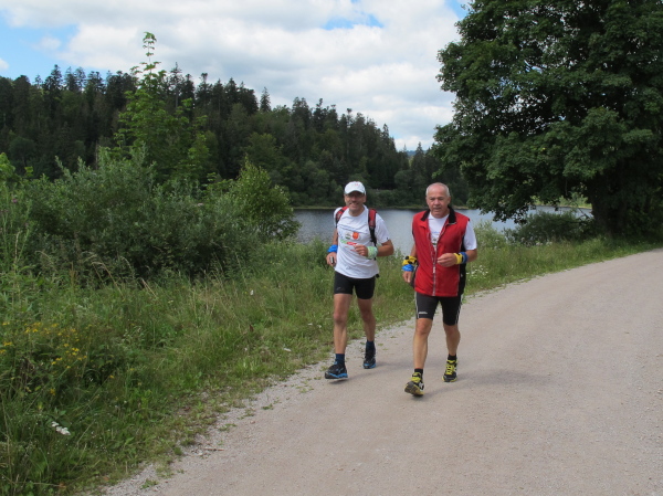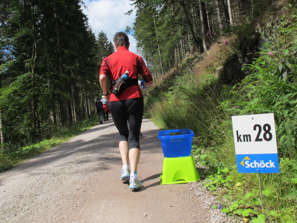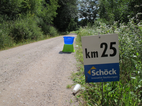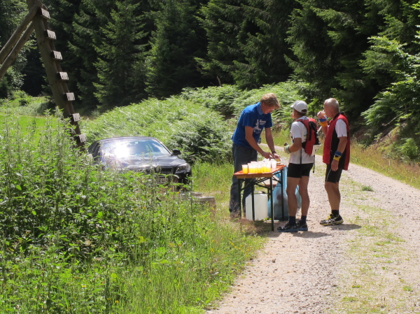 Bei km 25 sind wir direkt am See (668 m) und an einer gut bestückten Verpflegungsstelle. Sogar ein Sixpack bestes Badisches Premium-Pils steht bereit, bis jetzt unangetastet. „Ihr habt Glück, dass der Joe nicht da ist.“ „Warum“, will man wissen. Ich erklär es kurz. „Ok, dann schick den Joe nächstes Jahr vorbei. Wir sind vorbereitet.“
