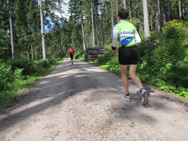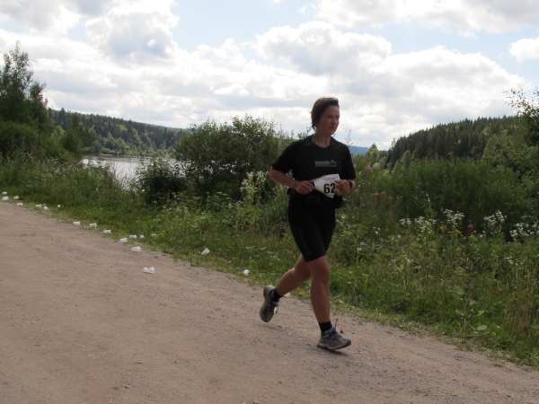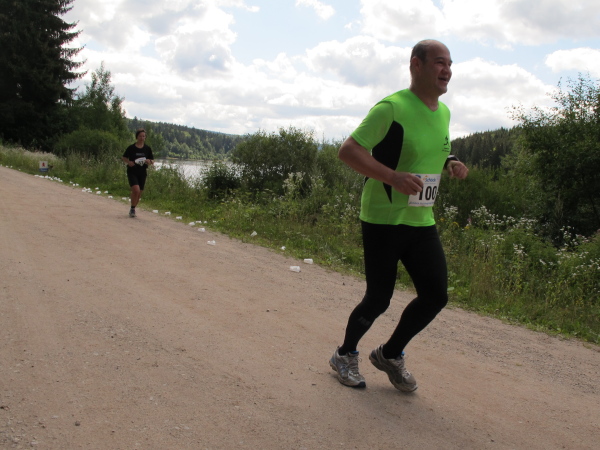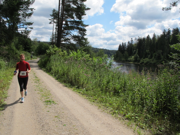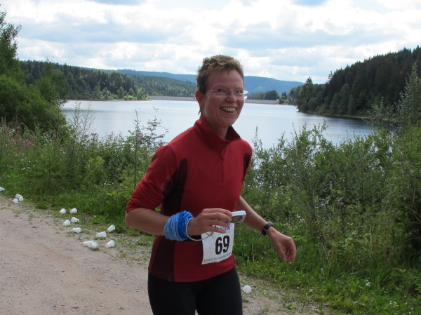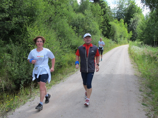 Aus Angst, der Joe könnte vielleicht doch heute schon vorbei kommen, haben die Drei von der Verpflegungsstelle jetzt jeder eine Flasche am Hals. Der Weg ist zunächst noch eben und man hat schöne Ausblicke auf den See. Als es steiler wird, muss ich langsamer machen, bleibe aber im Laufschritt. Das reicht nicht, zuerst zieht Inge, dann Gudrun an mir vorbei. Anders als ich halten die zwei W50er ihr Tempo von Anfang an durch. Egal, ob es rauf oder runter geht. Echt bewundernswert. Bei Männern spricht man in solchen Fällen von „alten Hasen“. Das kann ich mir hier natürlich nicht erlauben. Auch deshalb nicht, weil Inge erst ihren dritten Marathon läuft.