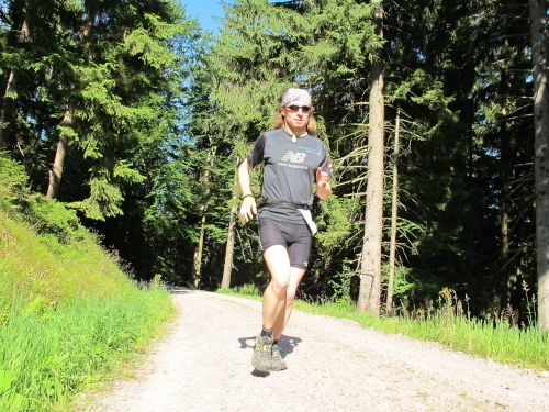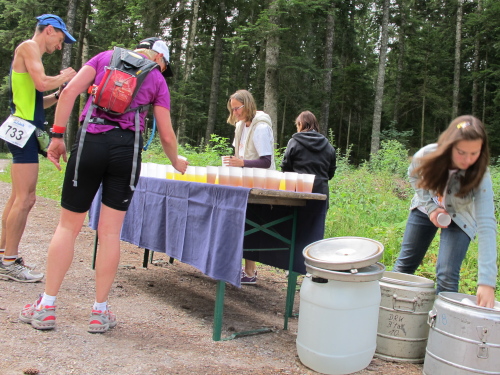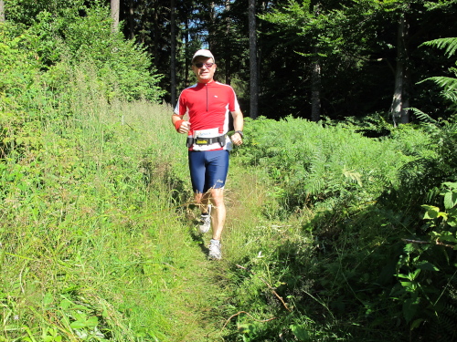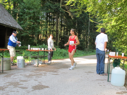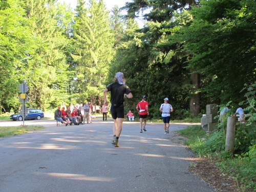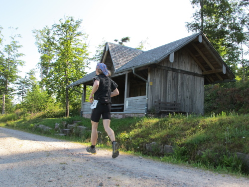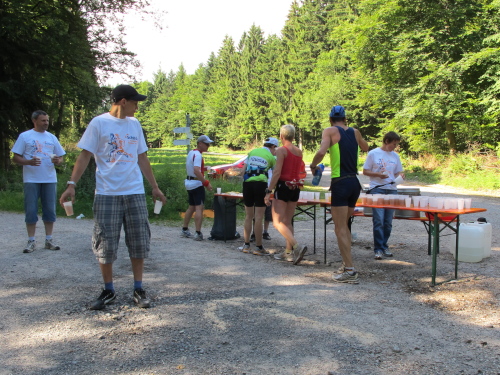 Nach einem kurzen Stück geht es rechts auf einen leicht abschüssigen Waldweg zum Plättig Hotel, wo dann die erste Steigung wartet. Links unten liegt das erwähnte Schlosshotel Bühlerhöhe und die „Adenauer-Kapelle“. Wir laufen Richtung Badener Höhe. Bevor es aber noch steiler wird, geht unsere Strecke links weg auf einen bequemen Höhenweg, an dem bei km 6 die erste Verpflegungsstelle liegt. Es gibt Tee, Iso, Wasser, Bananen, Äpfel und Brot.