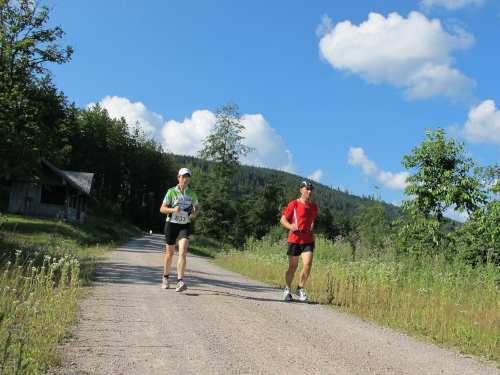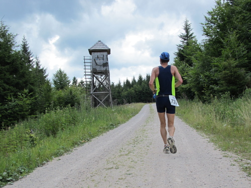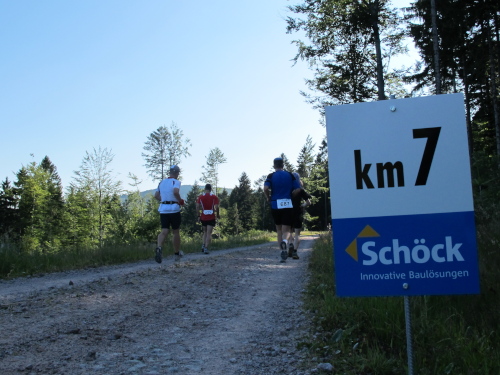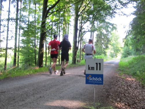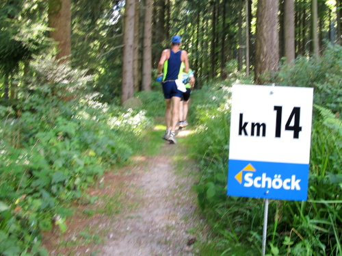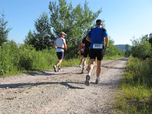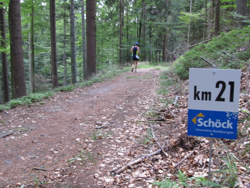 Und so kommt es zu dem Namen: Wenn sich bei Regen das Wasser in den Pfützen sammelt, spricht der Badener auch von einer Lache. Und durch den Buntsandstein ist hier das Wasser rot. Alles klar? Dann geht’s weiter, meist flach, auch mal unmerklich ansteigend. Bei der Halbdistanz signalisiert mit ein Blick zur Uhr, dass ich viel zu schnell unterwegs bin: 2:15, schneller war ich dieses Jahr noch nie. Ok, die Strecke beim Hornisgrinde Marathon führt bis km 26 tendenziell abwärts, dann kommen 16 km mit leichten Steigungen. 240 Höhenmeter, sagt der Veranstalter. Könnte stimmen. Also auch von dieser Seite kann ich jedem Skeptiker den Wind aus den Segeln nehmen. Tagessieger Ronny Seifert hat sogar eine neue persönliche Bestzeit aufgestellt.