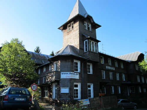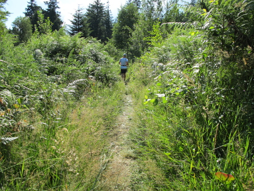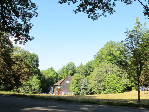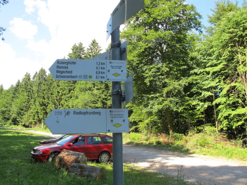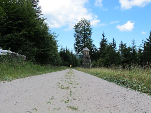Wir verlassen die Teerstraße und folgen wir einem schmalen Pfad, der mit Hecken und Farnkräutern fast zugewachsen ist. Ein richtiger Urwald, nur die Wildtiere fehlen. „Badischer Ho Tschi-Minh-Pfad“ habe ich den Weg mal getauft. Es läuft wie geschmiert. Nach 3 Kilometer „Traileinlage“ sind wir auf einer bequemen Teerstraße und folgen wenig später einem weiteren Pfad, der uns zur Roten Lache (690 m, km 15), der Passhöhe zwischen Baden-Baden und dem Murgtal bringt. Der gleichnamige Gasthof ist seit fast 100 Jahren ein beliebtes Ausflugsziel und bekannt für seine Torten (Schwarzwälder Kirschtorte) und Forellen.