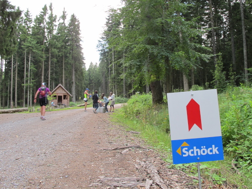 Nach der Bernsteinhütte (738 m – 8 km) geht es wieder leicht abwärts zum Scherrhof (676 m – 11,5 km), einem sehr beliebten Ausflugslokal. Nicht weit von hier hat die Oos, das Flüsschen, das durch Baden-Baden fließt, ihren Ursprung. Ein paar Leute, die ihren Frühschoppen mit „Marathon gucken“ verbinden, sind hier immer.