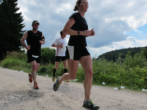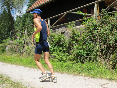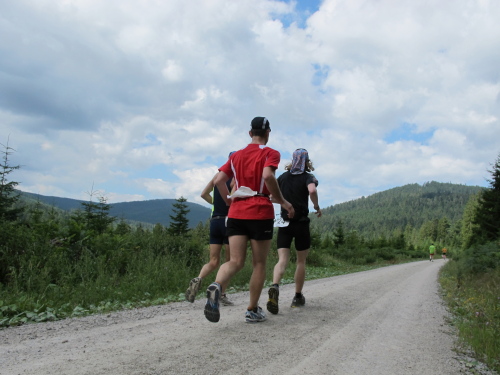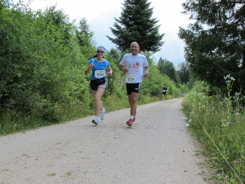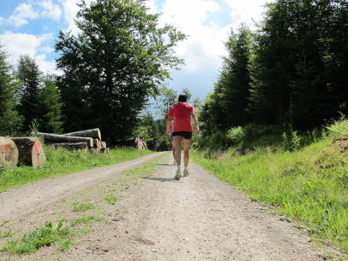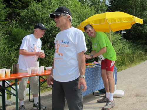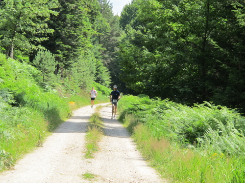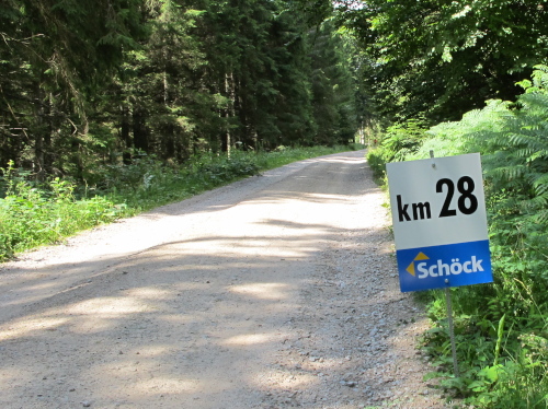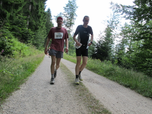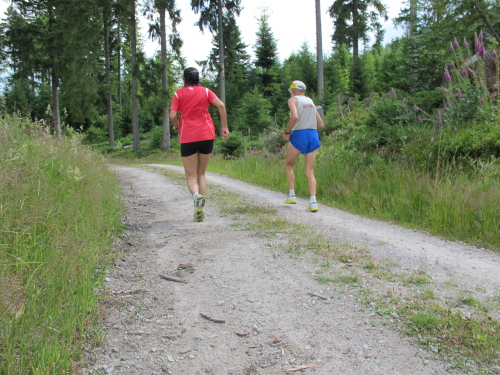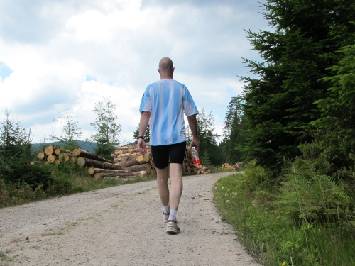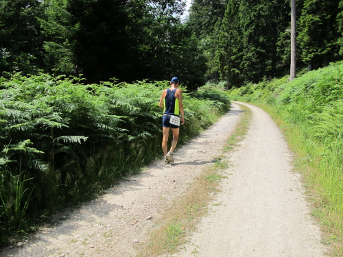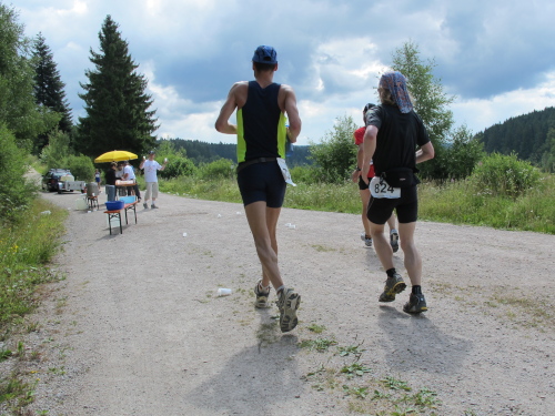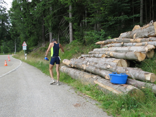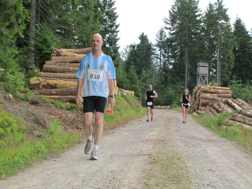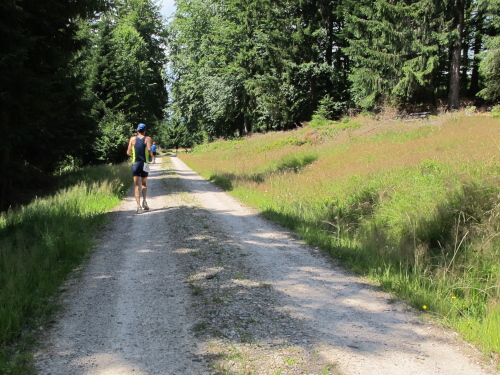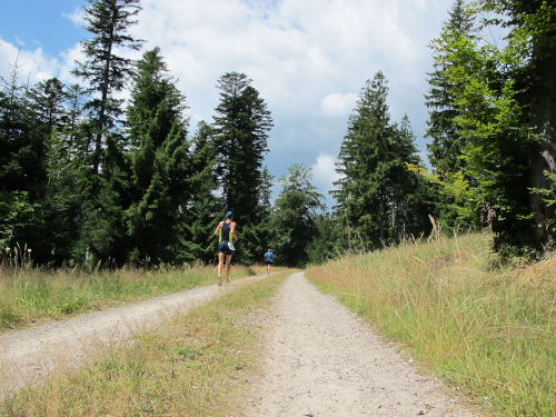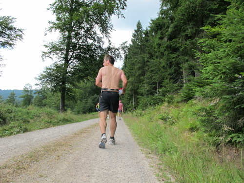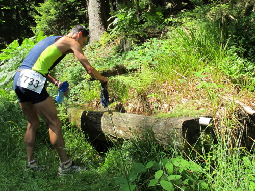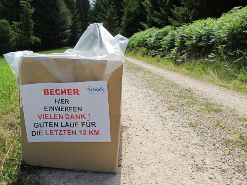 Jetzt wird es auf der Birkenaustraße, einem schottrigen Forstweg, etwas steil. Aber schon nach der ersten Kurve ist die Steigung moderat und für jeden gut zu laufen. In kurzen Abständen hat der Veranstalter Wasserwannen aufgestellt, an denen man sich erfrischen kann. Manchmal kann man dazu auch einen Naturbrunnen oder ein Bächlein nutzen. Dringlich ist es heute nicht, denn die Temperaturen bleiben im Rahmen.
