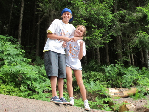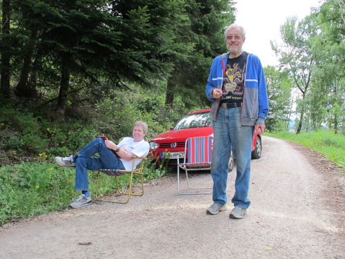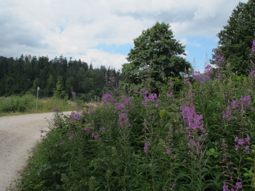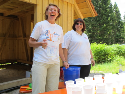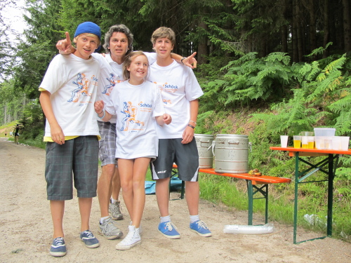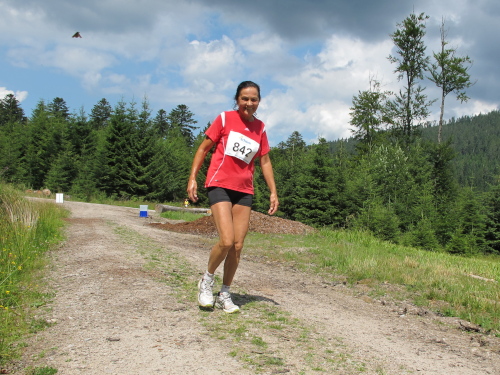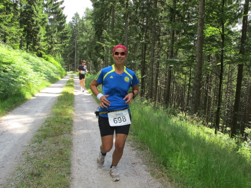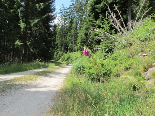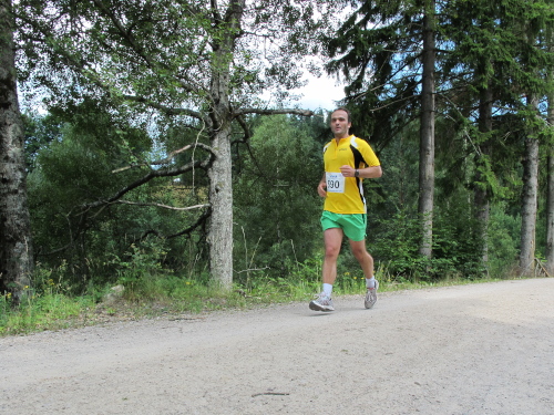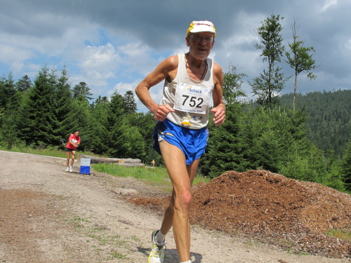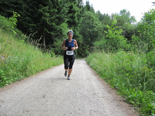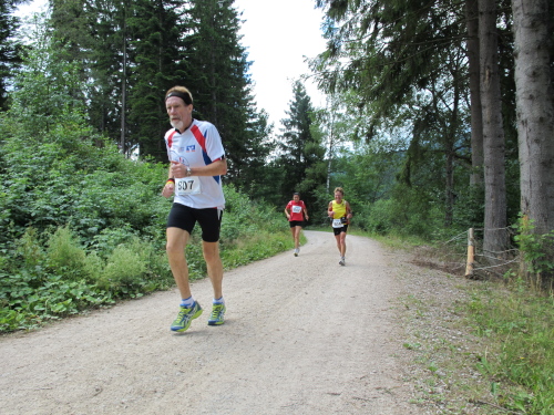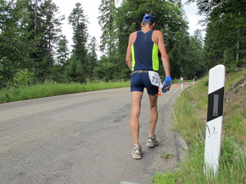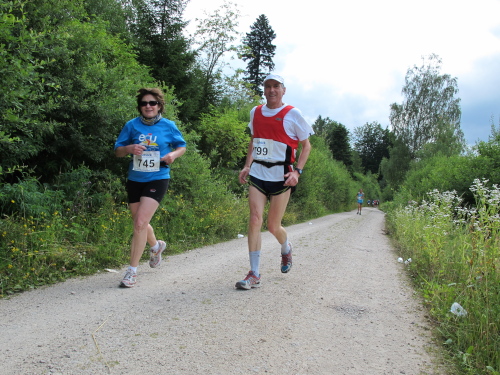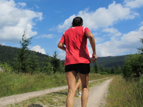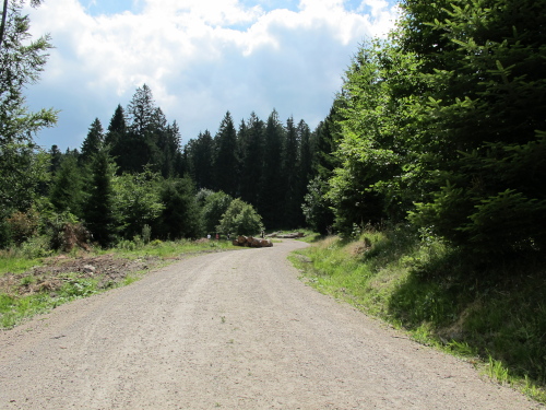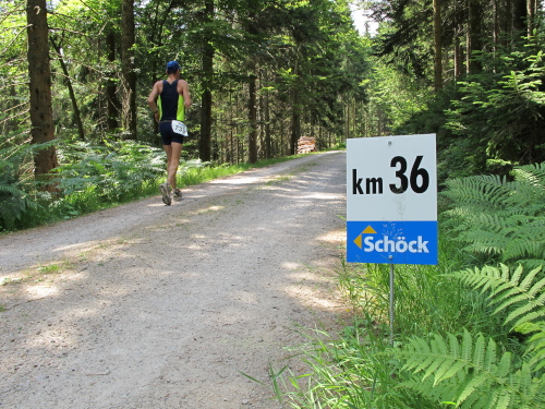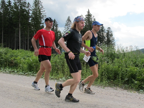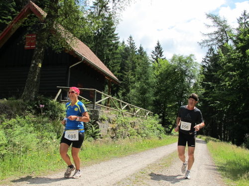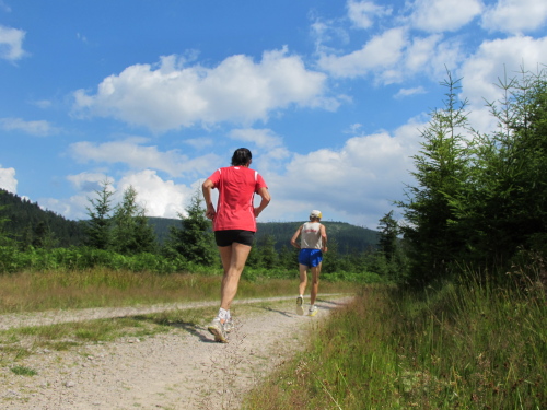 Jetzt wird es auf der Birkenaustraße, einem schottrigen Forstweg, etwas steil. Aber schon nach der ersten Kurve ist die Steigung moderat und für jeden gut zu laufen. In kurzen Abständen hat der Veranstalter Wasserwannen aufgestellt, an denen man sich erfrischen kann. Manchmal kann man dazu auch einen Naturbrunnen oder ein Bächlein nutzen. Dringlich ist es heute nicht, denn die Temperaturen bleiben im Rahmen.