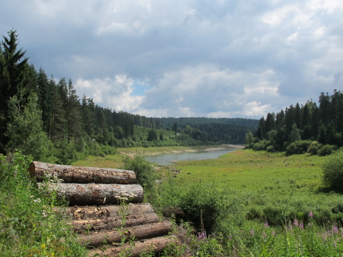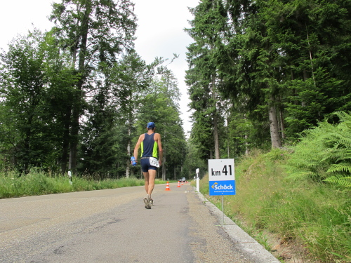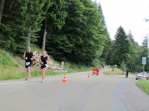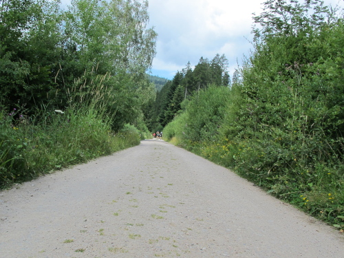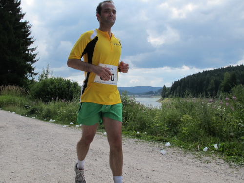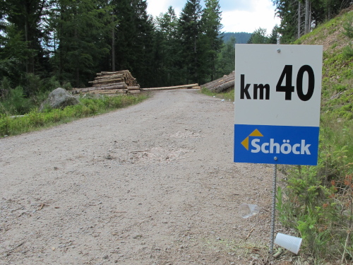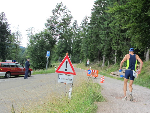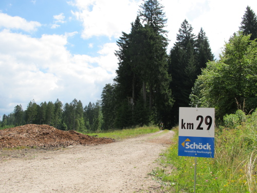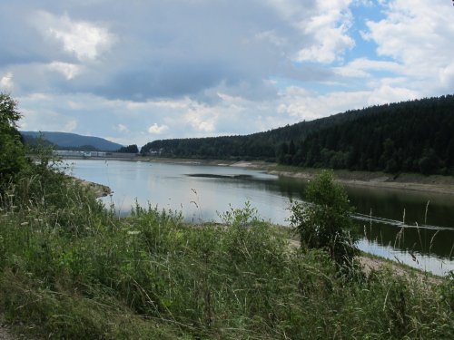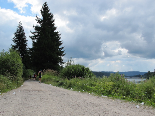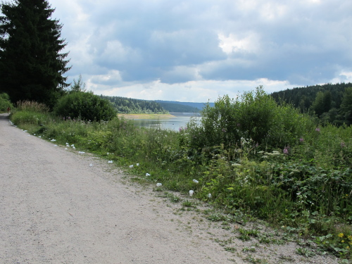 Wir laufen zunächst noch in entgegen gesetzter Richtung leicht ansteigend, dann aber abwärts und plötzlich scharf links ab in Richtung des Stausees (668 m, km 24). Normalerweise ist er bei schönem Wetter wie heute ein viel besuchtes Ausflugsziel für Einheimische und Urlauber. Heute ist es ruhig. Liegt es an der Baustelle an der Staumauer, oder ist das Wasser wie so oft in den letzten Jahren mit Algen verseucht? Ungefähr einen Kilometer folgen wir einer Pendelstrecke entlang dem See, dann geht es auf 2 Kilometern leicht aufwärts. Bei km 28 erreichen wir die Verbindungsstraße zwischen der Schwarzwald-Tälerstraße und der Schwarzwaldhochstraße, die wir unter Polizeischutz überqueren.