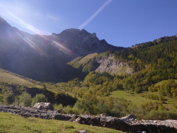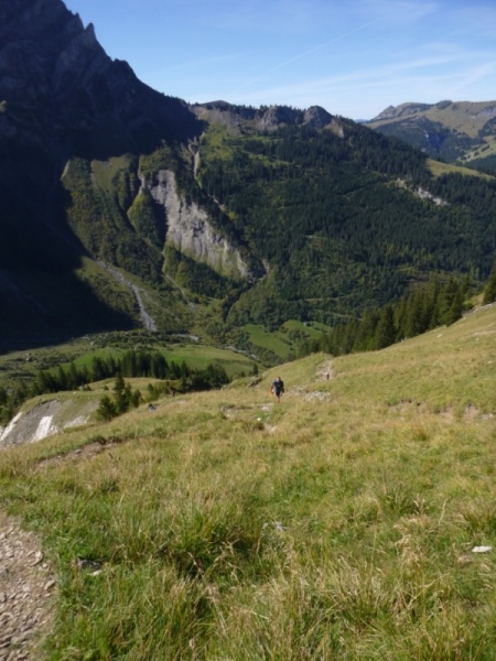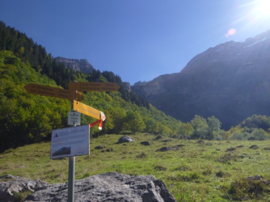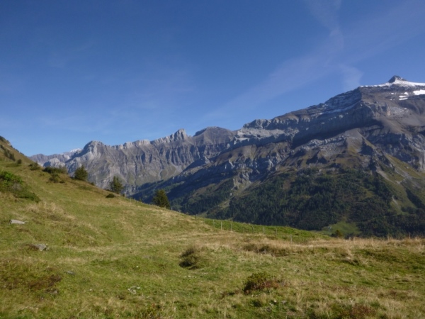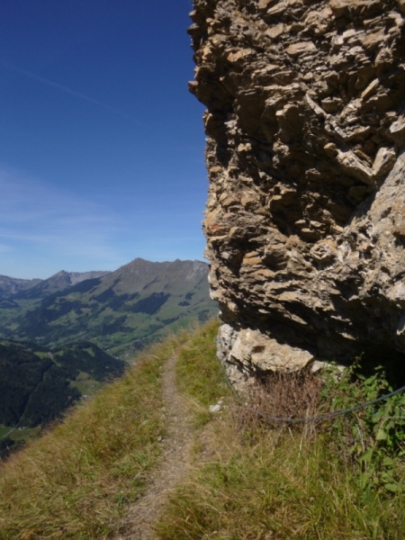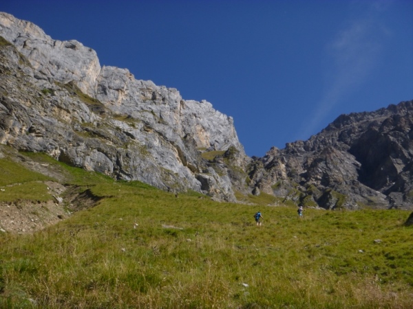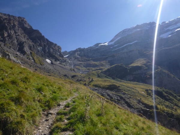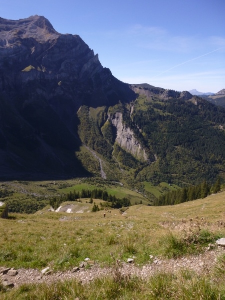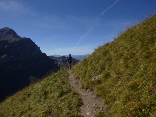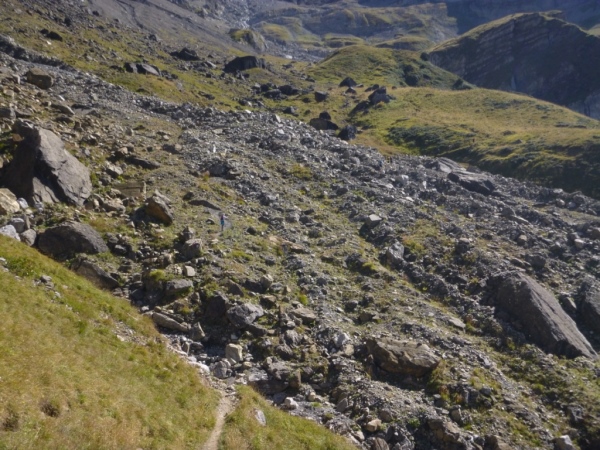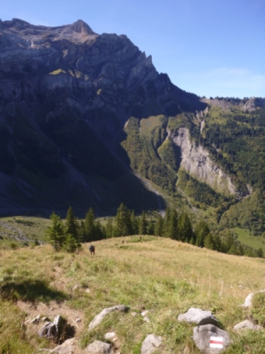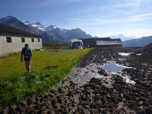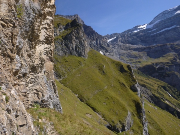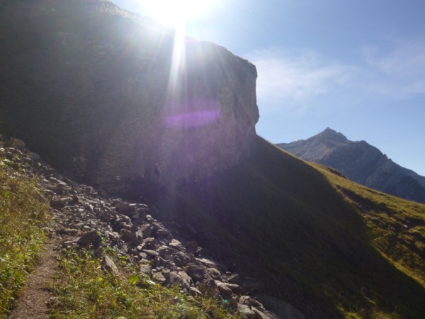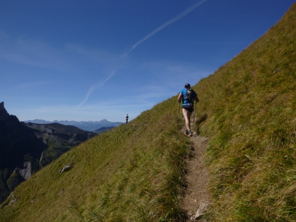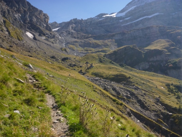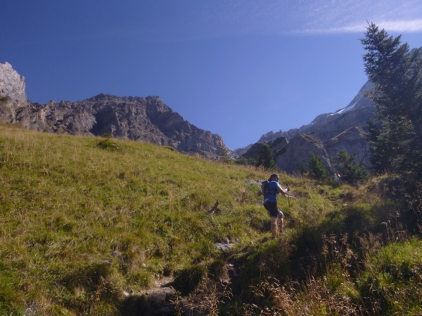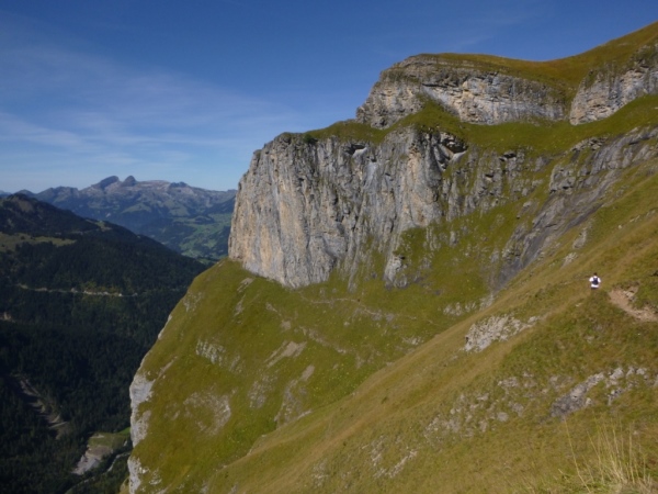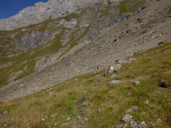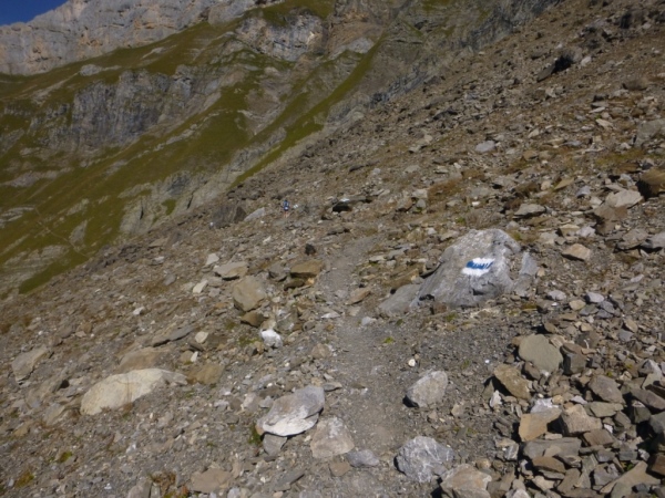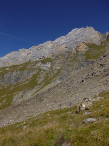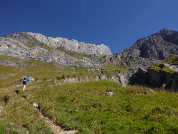 Über uns erhob sich die mächtige Felswand des Diablerets. Ein weiß-blau markierter Pfad schlängelte sich nun etwas unterhalb der Felswand entlang. Manchmal waren wir gefangen zwischen den steilen Felsklippen auf der einen Seite und dem Abgrund auf der anderen Seite. Da war nun volle Konzentration und gute Trittsicherheit gefragt, teilweise waren die Wege abgerutscht oder in einem schlechten Zustand. Doch nach etwa 4 Kilometer war auch dieser Streckenabschnitt Geschichte. Bald ging es über meist breite Wege hinunter zur VP am Col de Pillon (km 42/1546 m) zwischen Gsteig/Gstaad und les Diablerets.