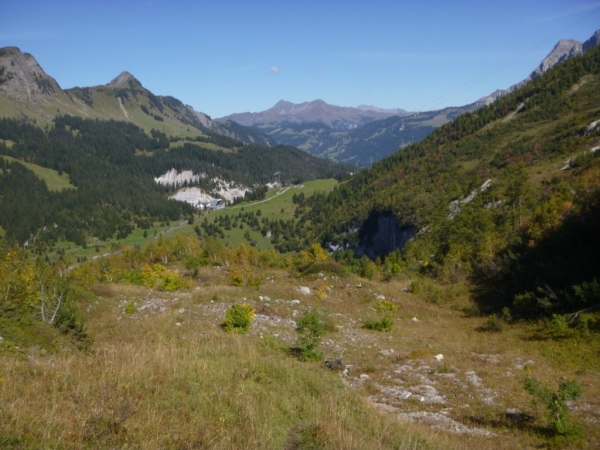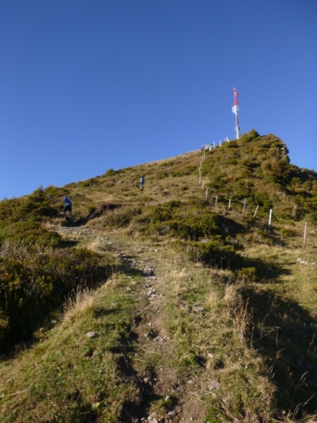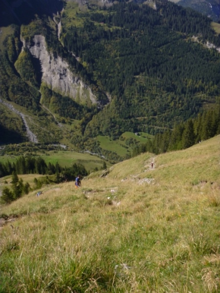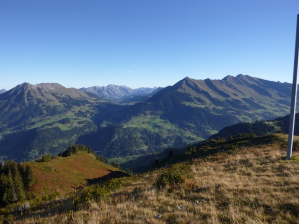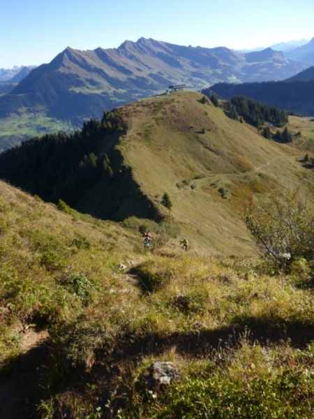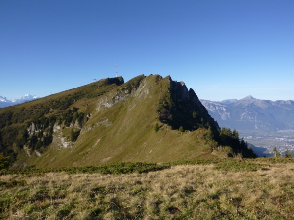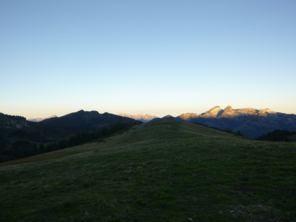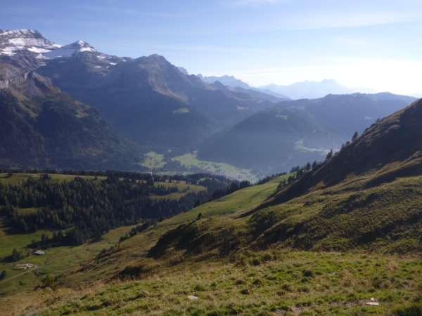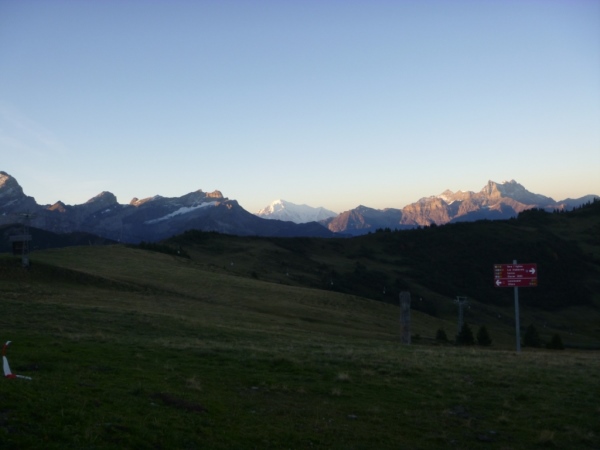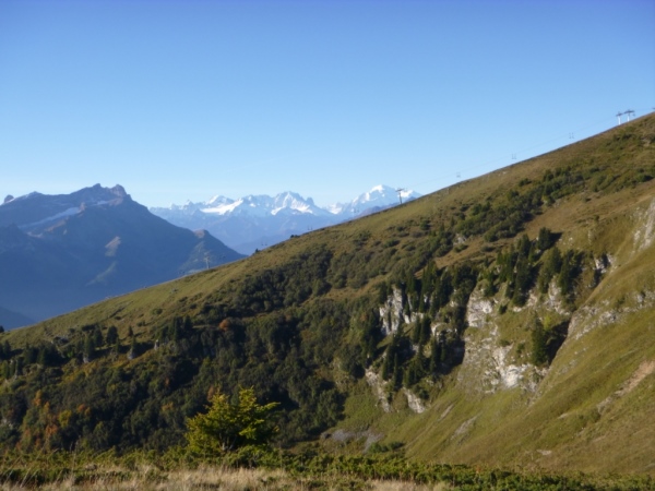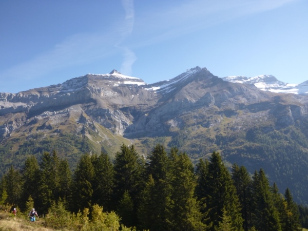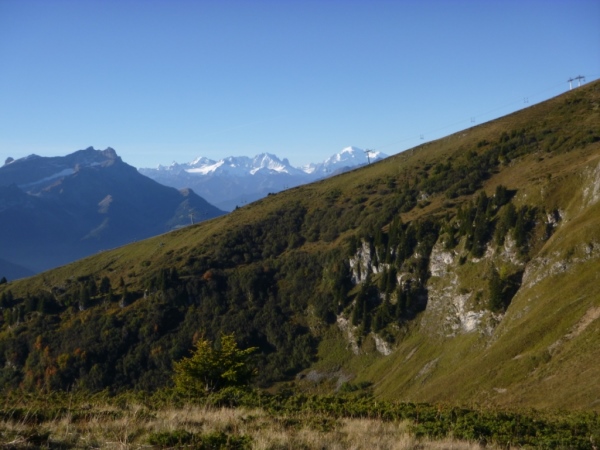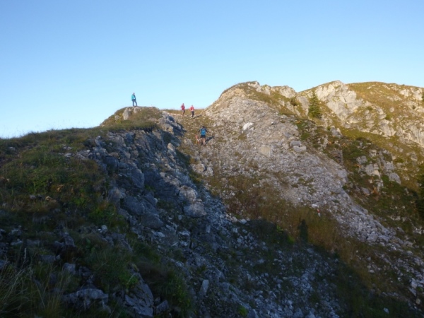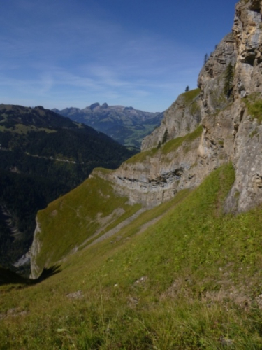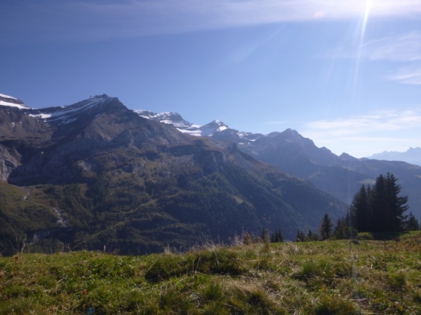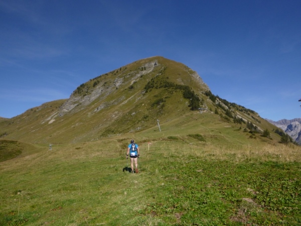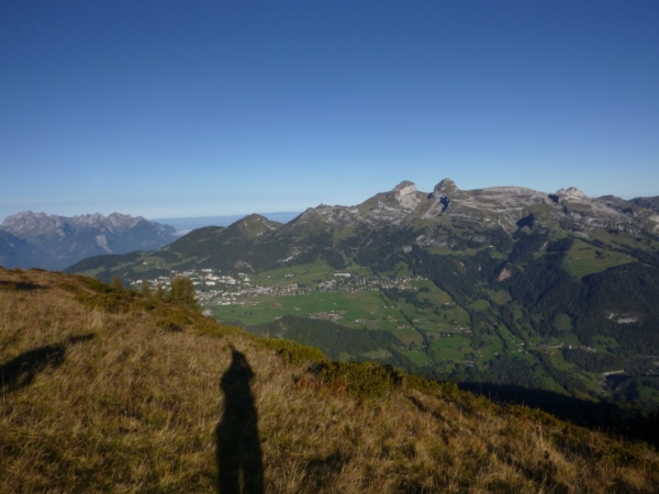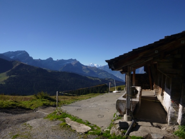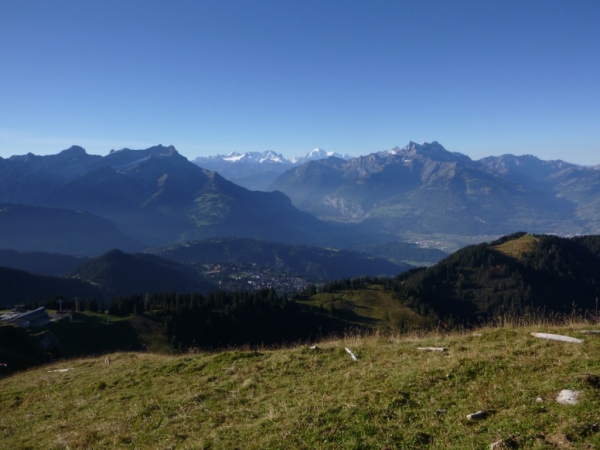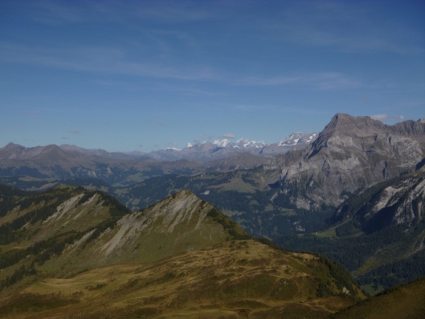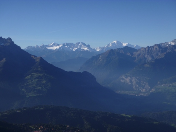 Der zweite Anstieg war dann der 2112 m hohe Grand Chamossaire. Zum Glück waren wir so früh am Morgen gestartet, so dass die Sonne noch nicht ihre volle Kraft entwickelt hatte. Trotzdem waren die steilen Anstiege sehr schweißtreibend. Zuerst ging es durch niedrige Sträucher, später über kahle Wiesen. Auf dem Chamossaire konnten wir dann einen herrlichen Rundblick auf das Bergpanorama mit dem Dents du Midi im Wallis, dem wolkenfreien Mont Blanc-Massiv und dem Diablerets-Massiv genießen. Auch der Genfer See war unter einer Dunstwolke erkennbar.
