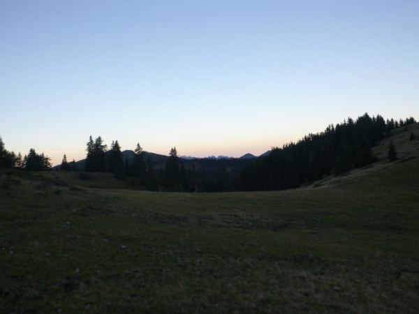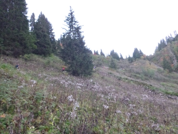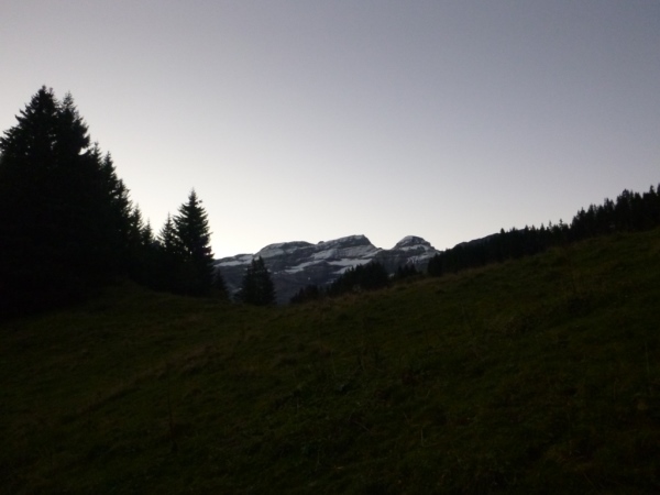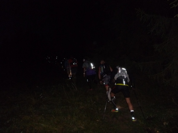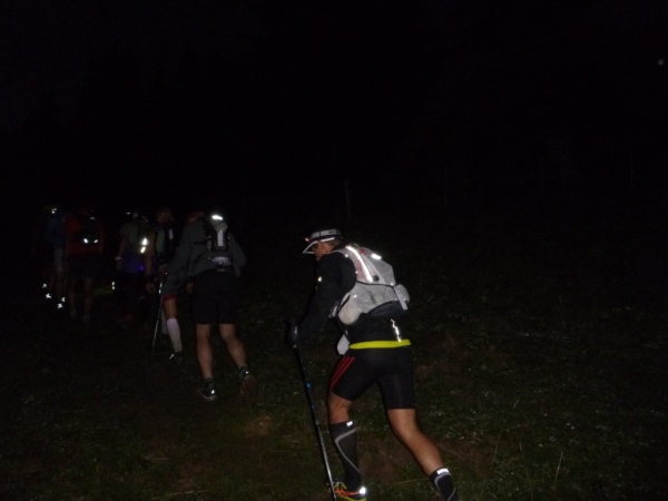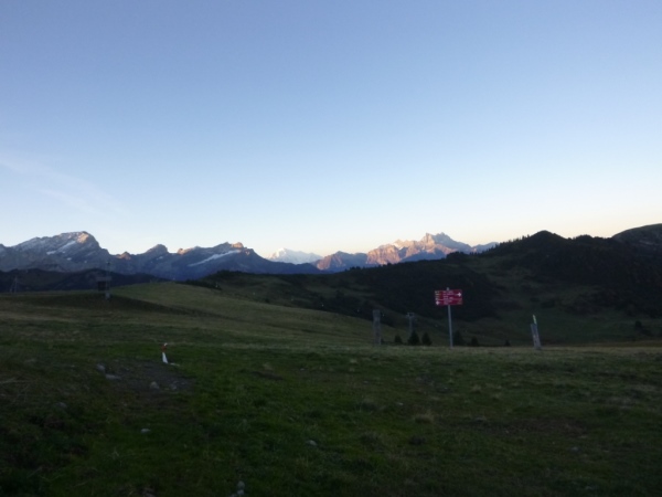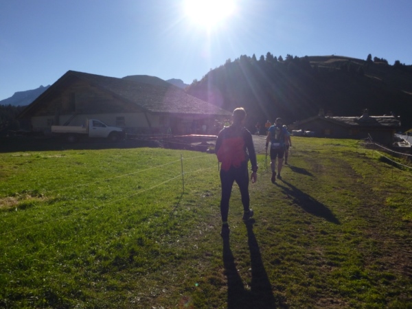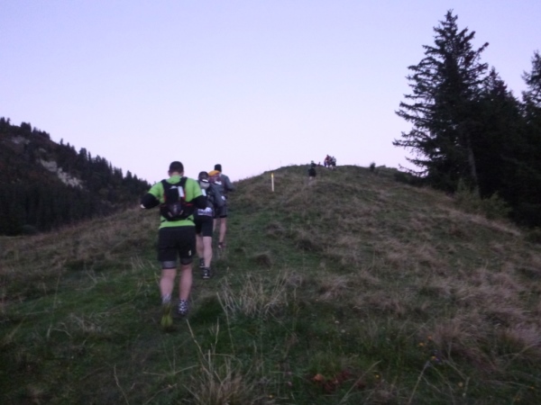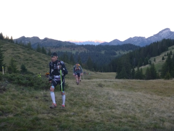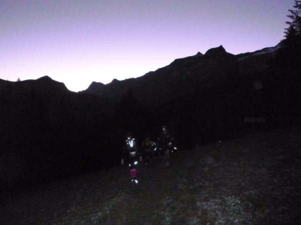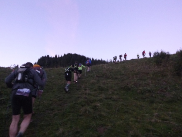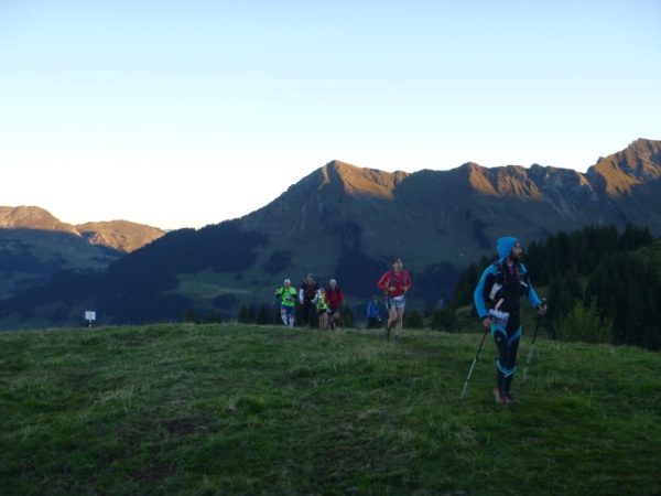 Ich hatte mir die 55 Kilometer und 3500 Höhenmeter für den morgigen Samstag vorgenommen. Dieser Wettkampf startete bereits um 6.15 Uhr am Place des Congrès in Les Diablerets (1163 m) und brachte uns zuerst auf asphaltierten Nebenstraßen talauswärts. Kaum hatten wir die Hauptstraße überquert, befanden wir uns auf einem steilen Wiesenhang, der uns zum Tête des Meillerets (km 5/1939 m) hinaufführte.