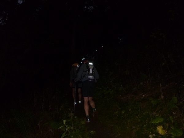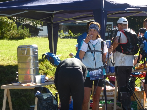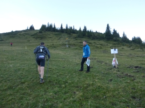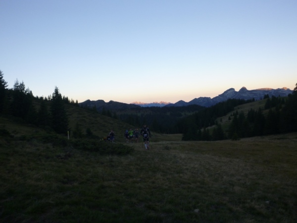 Eigentlich war der Platz auf dem Gipfel richtig schön zum Verweilen, eine leichte Brise wehte uns kühle Luft ins Gesicht. Doch dies war ein Wettkampf und keine Wanderung und wir wollten noch im Zeitlimit im Ziel ankommen. So entschieden wir uns schnell fürs Weiterlaufen, steil den Berg hinunter über viele Felsstufen bis zur nächsten kleinen VP in Isenau (km 48/1855 m).
