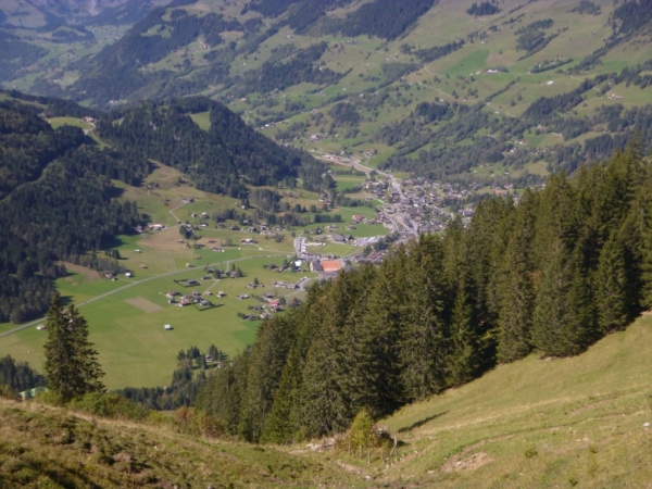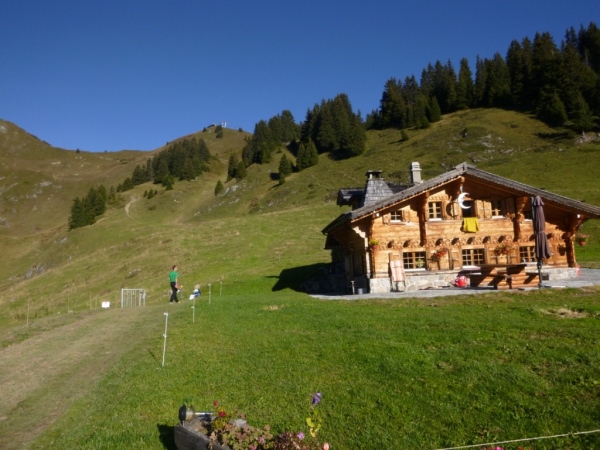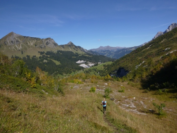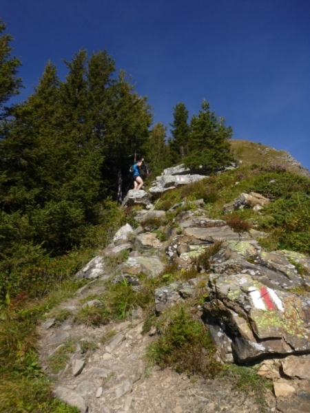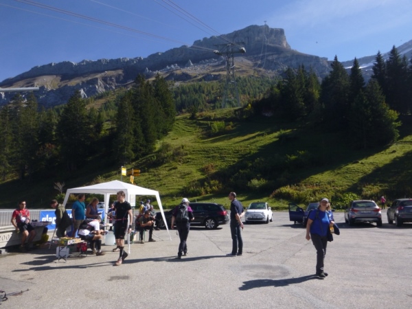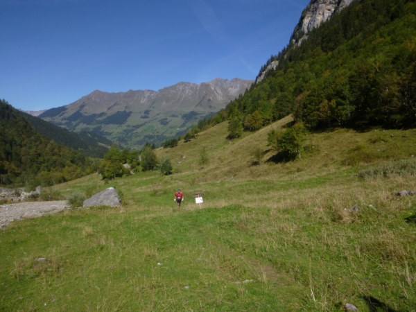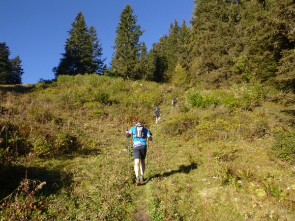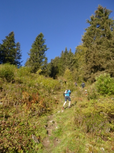 Nach etwa 5 Kilometer erreichten wir den Col de la Croix (1752 m), bevor wir über teils steile, wurzelige teils breite Wanderwege in Richtung Les Diablerets zurück liefen. Glücklicherweise waren hier die meisten Wege im schattigen Wald, so dass die Sonnenstrahlen uns nicht zu sehr erhitzten. In Les Diablerets kamen wir dann durch das Start- und Zielgelände, wo eine weitere VP (km 27/ 1163 m/ Zeitlimit 11.30 Uhr) aufgebaut war. Hier hatten wir auch Halbzeit mit etwa 27 Kilometern, bevor wir uns auf die zweite Runde begaben.