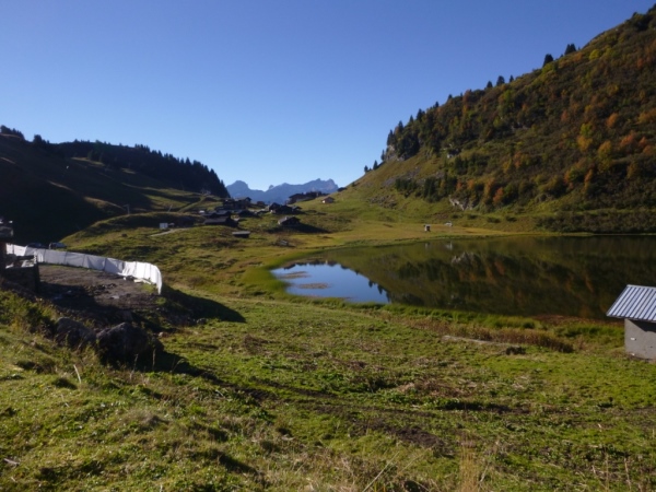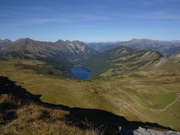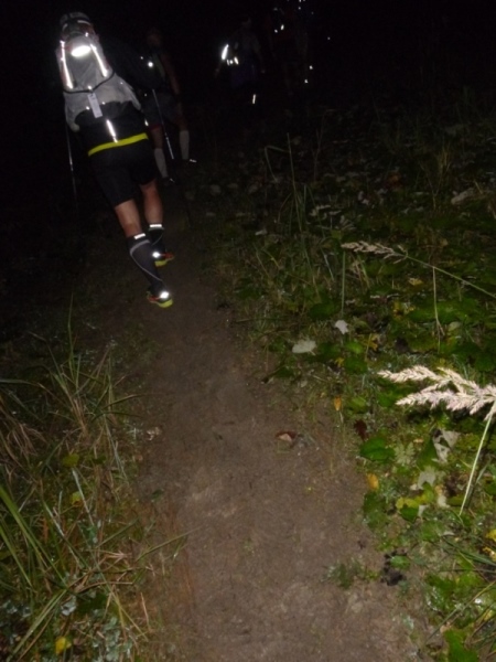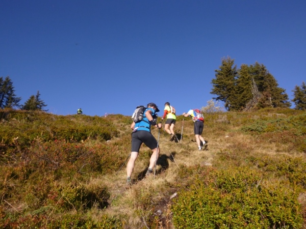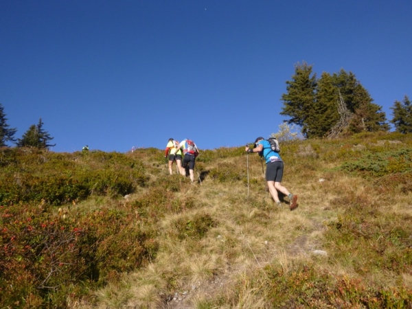 Über steile Skiwiesen ging es dann auf direktem Weg hinunter zur ersten großen VP Bretaye (km 15/1780 m). Doch zuerst mussten wir den Lac de Bretaye umrunden, bevor wir uns mit der üblichen Trailverpflegung stärken konnten. Am Col de Bretaye (1806 m) ging es weiter in Richtung Col de la Croix. Hier endete auch die Zahnradbahn, die im Sommer die Wanderer oder Spaziergänger aus Villars und im Winter die Skifahrer hinauf in die Berge bringt.