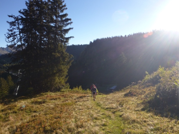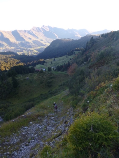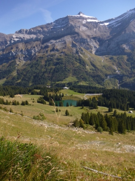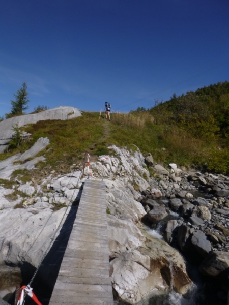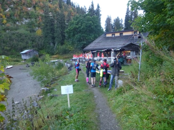 Nach dem Meillerets blieben wir auf etwas mehr als 1900 m, um über einen felsigen, zum Teil mit Ketten gesicherten Gradweg von einem Kilometer Länge unser Trailkönnen unter Beweis zu stellen. Ein schnelles Vorankommen war hier kaum möglich, wenn wir ja verletzungsfrei durchkommen wollten. Bis zur ersten VP am Lac des Chavannes (km 11,5/1692 m/nur Getränke) verloren wir dann auf steilen Singletrails und matschigen Wiesenwegen etwa 500 Höhenmeter.