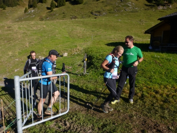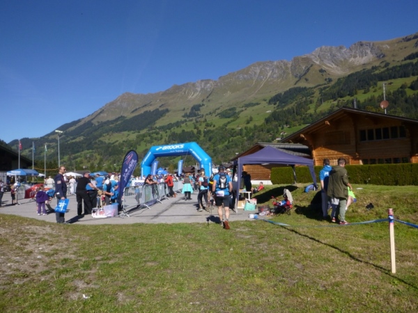 Noch einmal sollte es etwa 200 Höhenmeter ansteigen, bevor wir im Sturzflug nach Les Diablerets laufen durften. Der einzige Trost war, dass wir den kürzesten Weg hinunter ins Tal nahmen. Unsere Beine schmerzten von den steilen Abstiegen über Felsen, staubige Pfade und Wiesenwege. Glücklicherweise kamen die Häuser von Les Diablerets schnell näher und das bedeutete, dass auch das Ziel nicht mehr weit war. Im Ziel wurden wir gebührend begrüßt und zu unserem Finish beglückwünscht. Allerdings gab es weder Medaille noch Finishershirt, um möglichst viele Gelder für die Nepalprojekte zurückzuhalten.