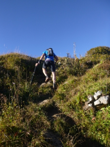 Nur noch 13 Kilometer trennten uns vom Ziel in Les Diablerets, aber dieser Teil sollte uns noch einmal bis aufs letzte fordern. Zuerst war der Anstieg auf den letzten und höchsten Berg La Palette (km 46/2150 m) recht moderat. Doch das sollte sich am Ende eines Schleppliftes schnell ändern. Über eine Bergflanke ging der steile Felsenpfad mehr oder minder senkrecht nach oben. Nur einen Kilometer lang, aber dieser Kilometer erschien uns unendlich. Keine Pause wurde uns gegönnt und die Nachmittagssonne brannte erbarmungslos.