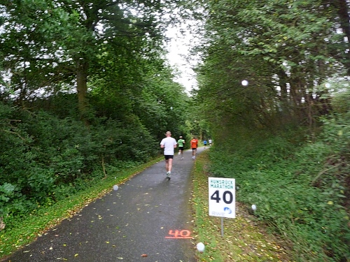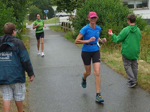 Bei km 31 (km 10 der HM-Strecke) überholt mich der Spitzenläufer der Halbmarathonis. Auch hier versuche ich dranzubleiben. Der permanente Aderlass der letzten Nacht hat gut getan. Alles ist optimal, die Orga, die Verpflegung, der leichte Regen. Nur der Wind, der kräftig von vorne bläst, stört ein wenig.