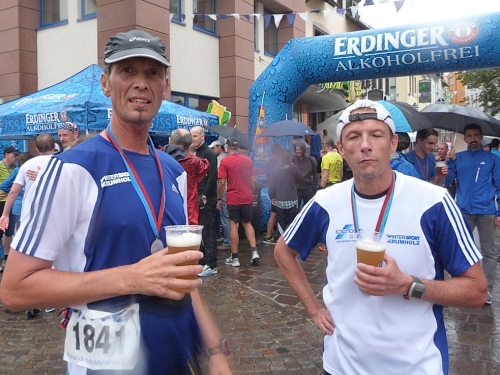 Im Tunnel vor Simmern überhole ich Thomas, es ist sein erster Marathon. Karl Wolfgang hat ihn bis hierin gezogen, jetzt übernehme ich. Doch wir verlassen die alte Bahnstrecke und müssen hinter dem Tunnel die scharfe Steigung nehmen. 110% meiner Laufleistung bringt mich fast um und Thomas einige Meter hinter mich. Matthias brennt mir auf der Zielgeraden einen auf die Schulter, wofür er sich später entschuldigt. Aber das bringt mir nochmal Sekunden für die Zielzeit ein. Was für ein herrlicher, schneller Lauf ! Da hat alles gepasst.