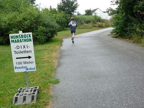 Kastellaun, hier war um 11:30 der Start des Halbmarathons. Die HM-Strecke führt um den Felsen der Sponheimer Burg und biegt dann auf unsere Strecke ein. Zunächst aber biegen die schnellen, kleinen Läufer der Schülerstaffeln ein. Ottmar macht hier hervorragende Nachwuchsarbeit, denn ich habe ziemlich Mühe, an den Jungläufern dran zu bleiben.