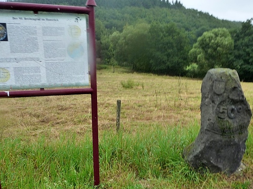 Auf der rechten Seite die spärlich bewachsenen Abraumhalden der Erzgrube Eid (Silber, Kupfer, Blei, Zink ). Ein kilometerlanger, tiefer Wassergraben leitete das Wasser vom parallel zur Laufstrecke fließenden Külzbach zur Hütte. Die ehemaligen Klärgruben werden heute als Fischteiche genutzt. Auch die Stolleneingänge sind noch vorhanden.