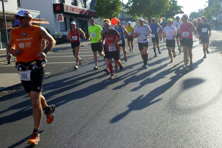 Die Inline-Skater starten um 8:45 Uhr, wir werden eine Viertelstunde später auf die Strecke geschickt. Als „Aufwärmprogramm“ geht es auf den ersten 4 Kilometern leicht bergab, ein kurzes Begegnungsstück gibt es auch. Bei km 1,7 sind wir den Führenden naturgemäß noch dicht auf den Fersen. Unglaublich, wie viele Emmelshausener sich das Event nicht entgehen lassen und uns anfeuern oder gar am Streckenrand frühstücken. Da rufe ich gerne mal „Schön habt ihr es hier“, und das stimmt: In Basselscheid kommen wir an vielen noblen Villen vorbei. Dann wieder zurück nach „downtown Emmelshausen“. Unser 4-Stunden-Pacer Rudi nennt die Zuschauer Bergbauern, so steil geht es nun wieder nach oben. Am Startplatz sind noch mal alle Emmelshausener versammelt. Hier findet heute der traditionelle Weinmarkt statt, da geht es also gleich gesellig weiter.